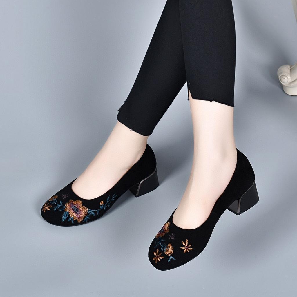 Женские лоферы с круглым носком 2025 новая этническая вышивка ретро туфли одинарки овчина мелкий вырез удобные на высоком каблуке балетки