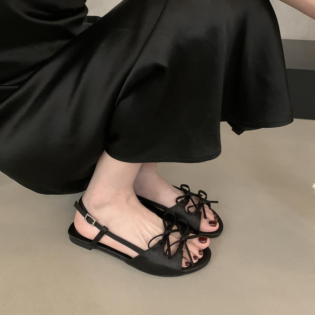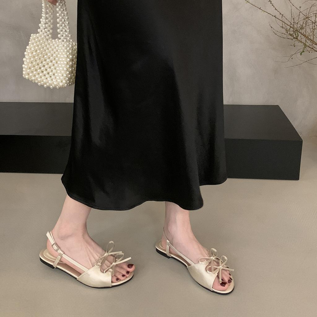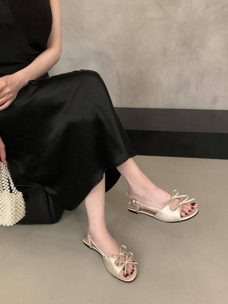 Французские атласные туфли-сандалии с открытым носком, с бантом, на плоской подошве, для лета 2025 года, новые, с круглым носком, для улицы, на плоском каблуке, крутые шлепанцы