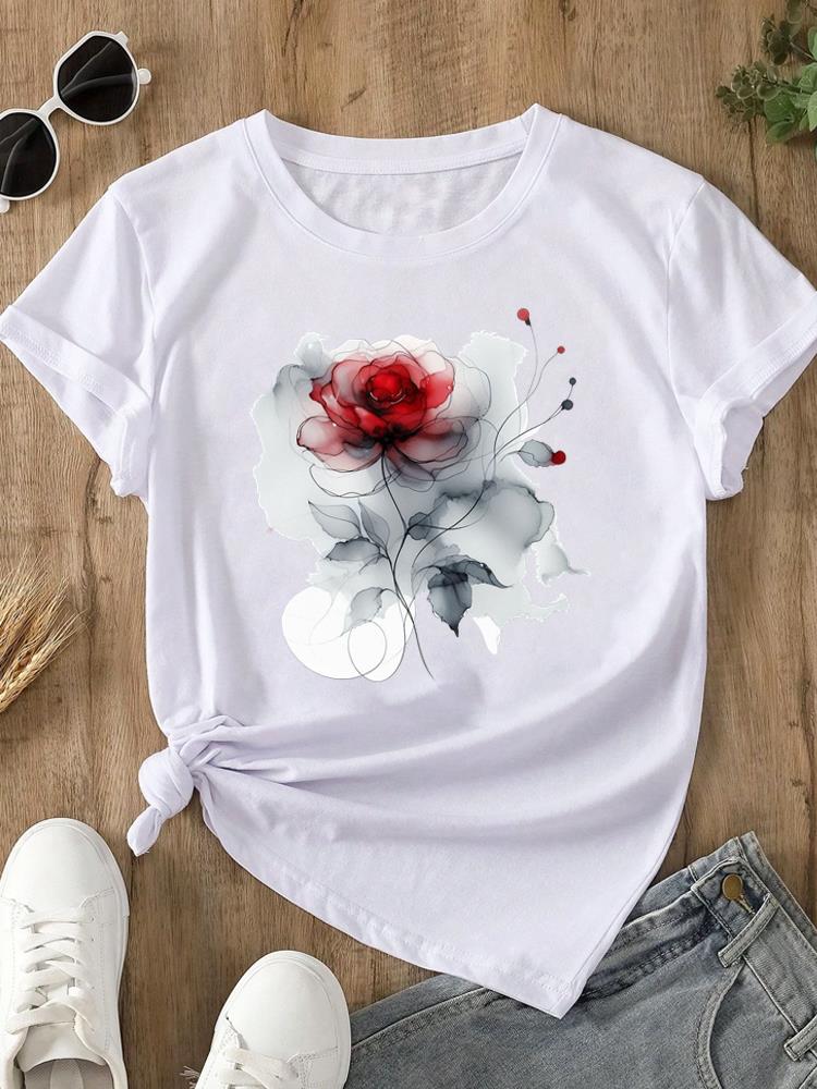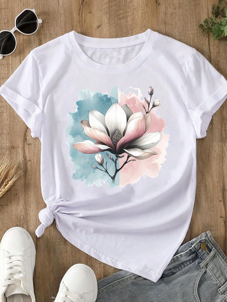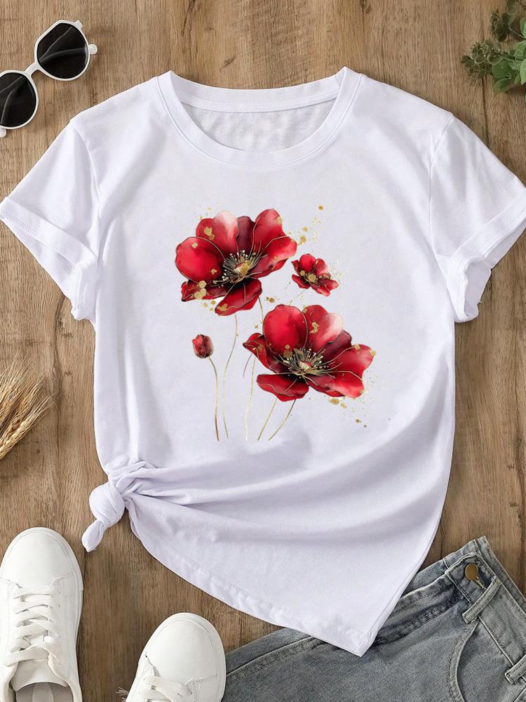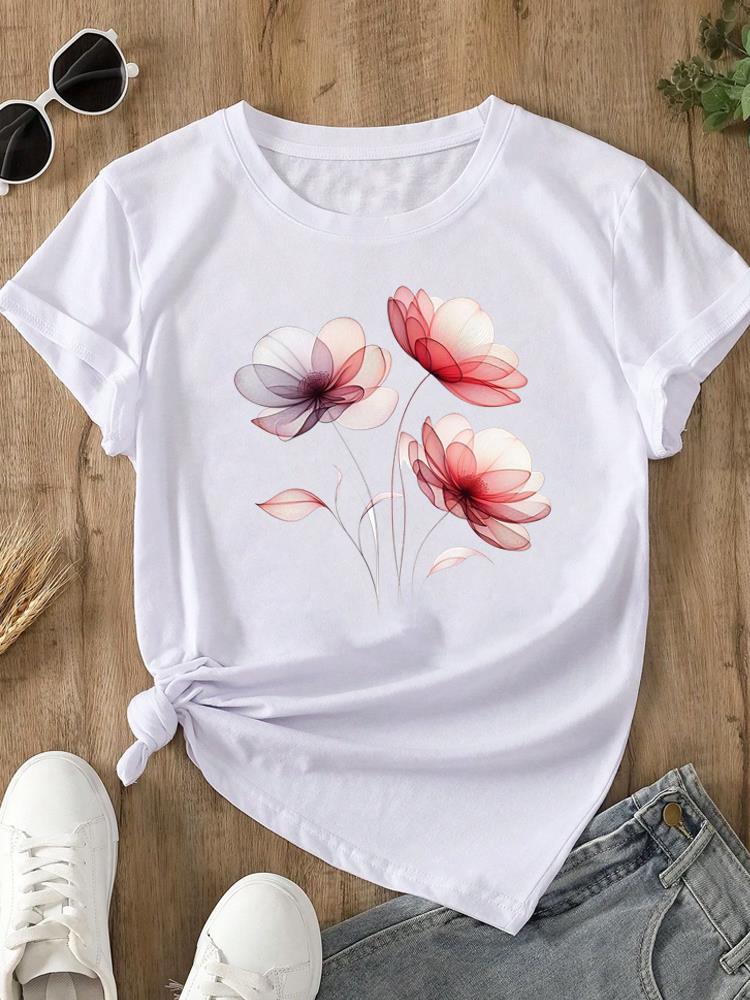 (Азиатский размер) цветочный милый с круглым вырезом женский топ футболка одежда принт короткий рукав футболки мода женская повседневная графическая футболка