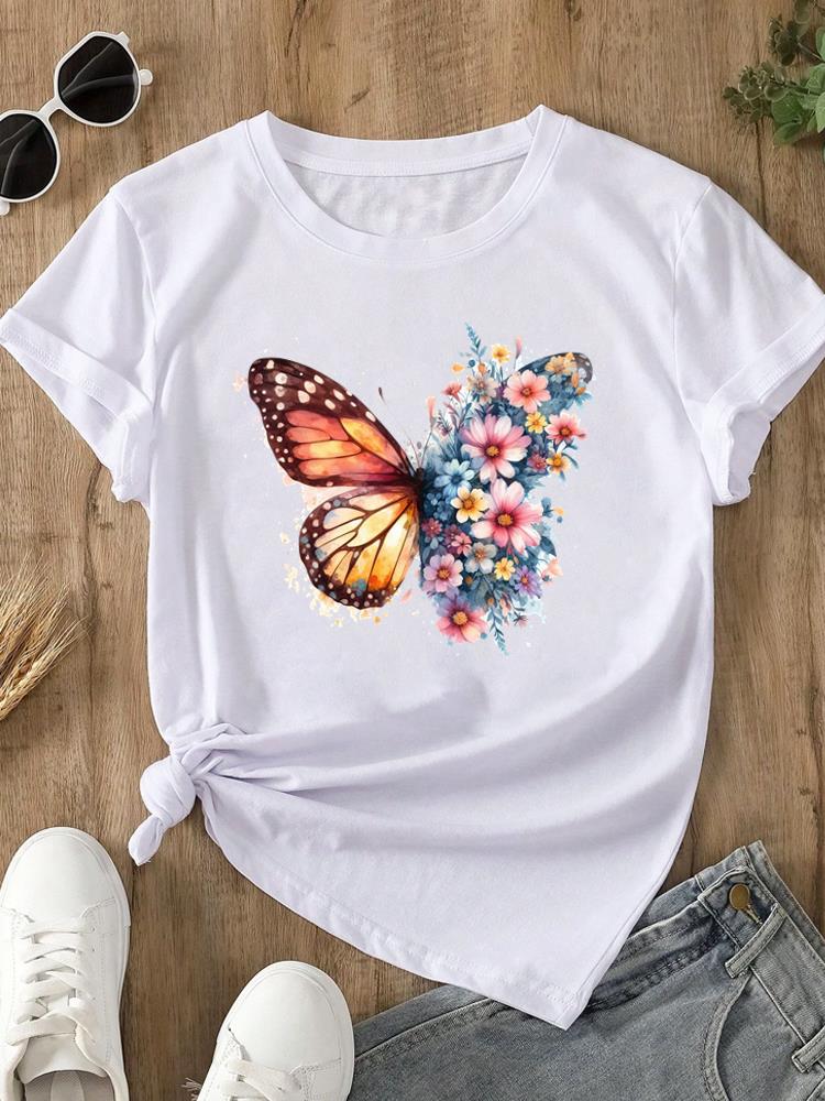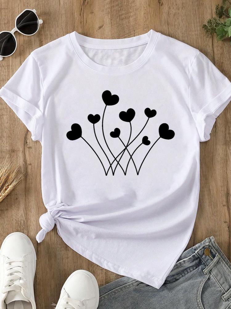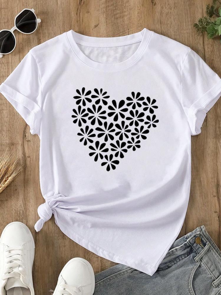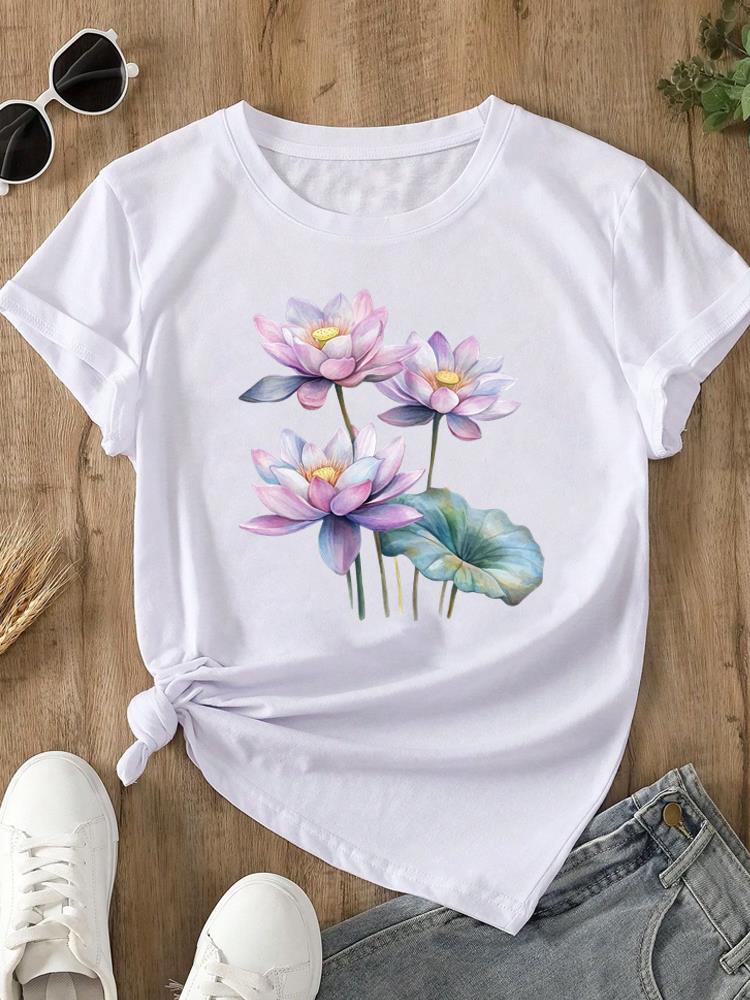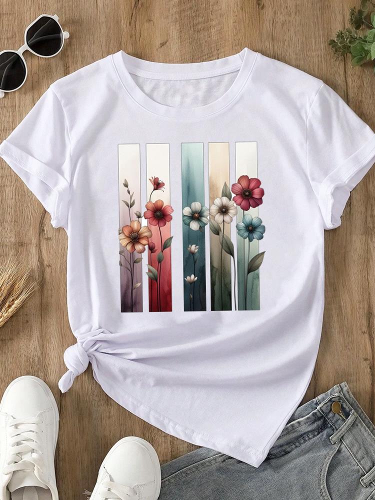 (Азиатский размер) цветочный милый с круглым вырезом женский топ футболка одежда принт короткий рукав футболки мода женская повседневная графическая футболка
