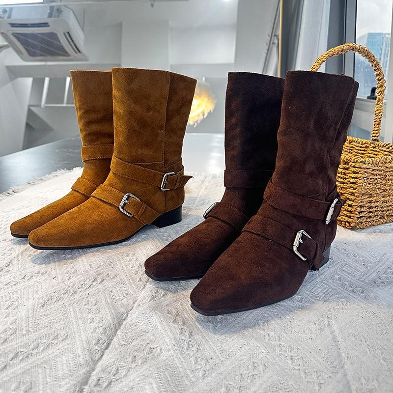 Новые ретро замшевые короткие ботинки осень и зима ботинки Мартин повседневные остроносые ковбойские джинсовые с пряжкой женские ботинки тренд
