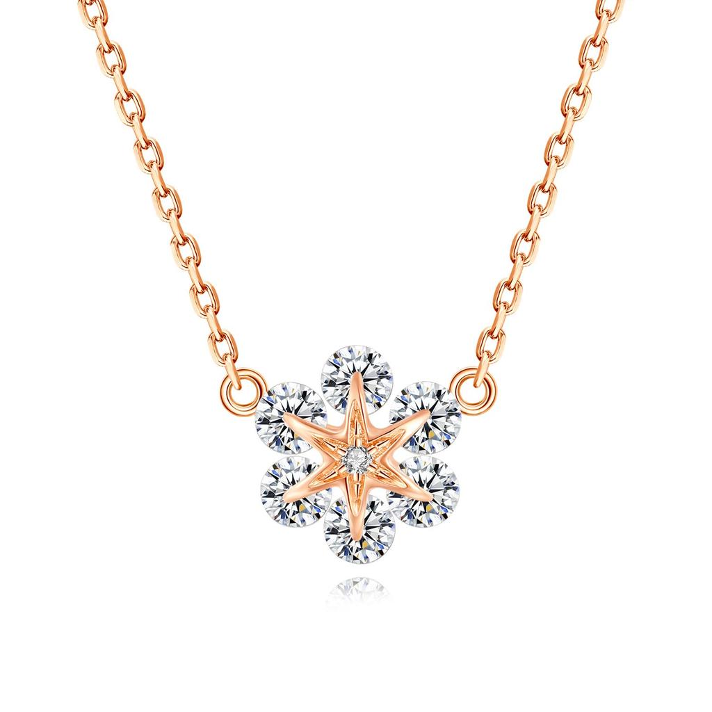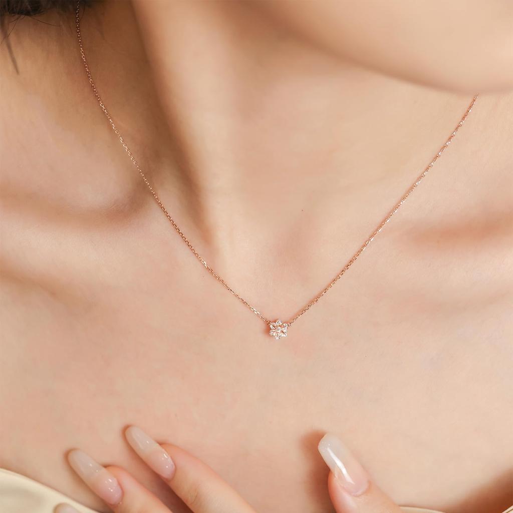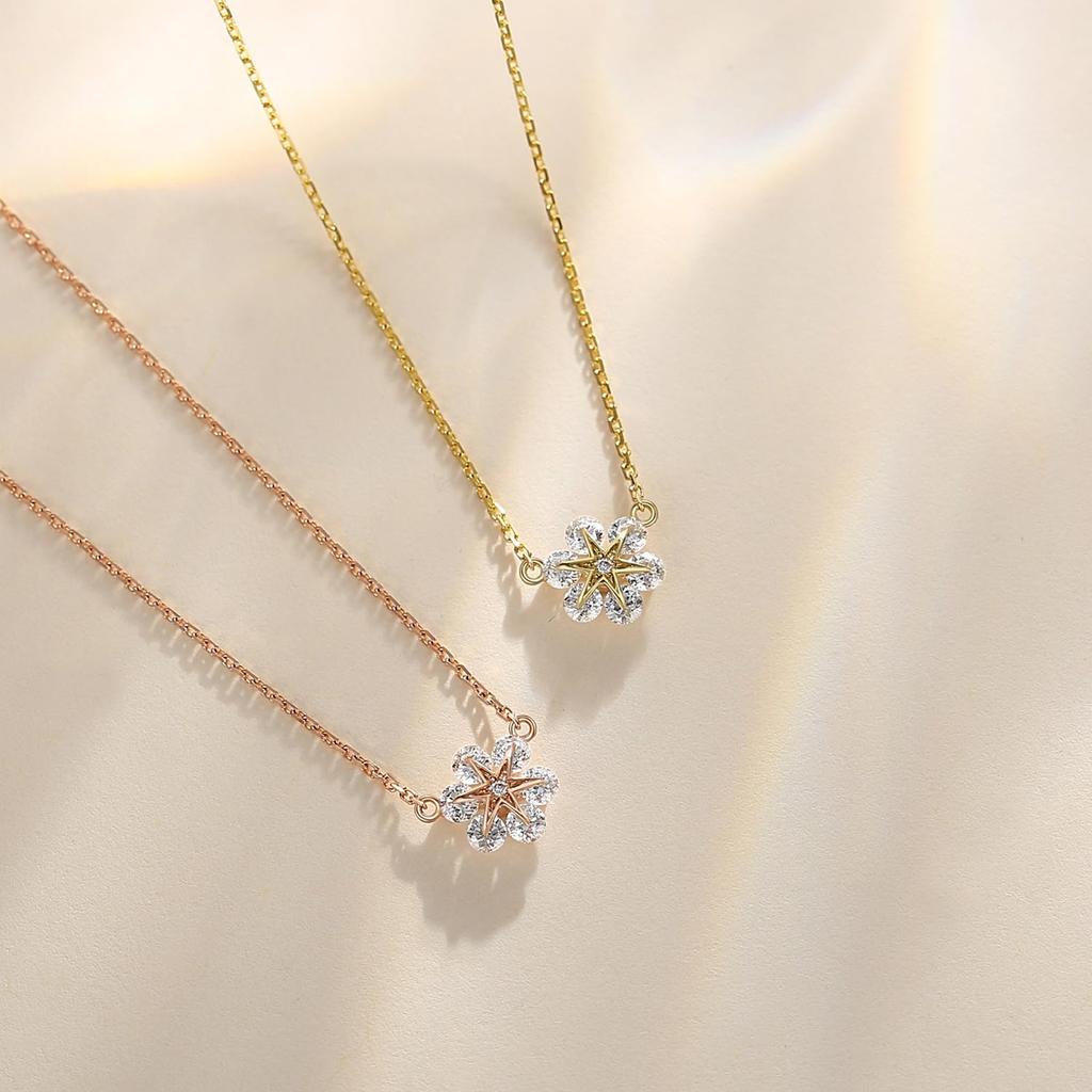 Это ожерелье вдохновлено снежинками. Шесть бриллиантов закреплены в золотом дизайне снежинки, и когда бриллианты покачиваются, подвеска сверкает искрящимся светом, создавая изысканное и гламурное впечатление.. Говорят, что золотой цвет хорошо дополняет японские тона кожи.. Просто надев его, вы подчеркнете ключицу, создавая женственное и гламурное впечатление.