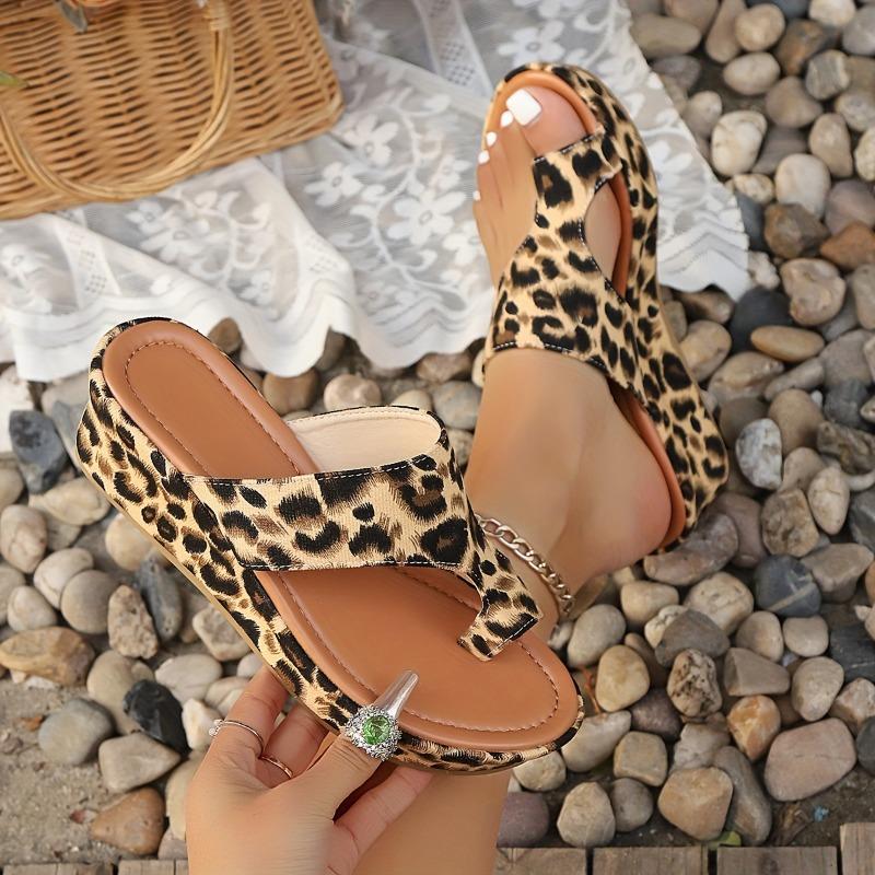 Новые летние женские модные леопардовые сандалии на танкетке, удобная толстая подошва, пляжный стиль, леопардовая обувь