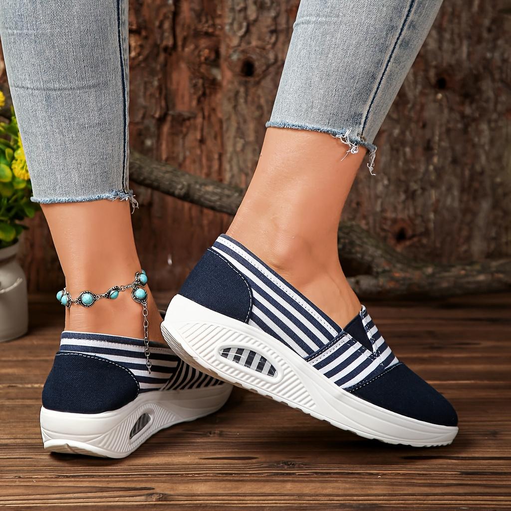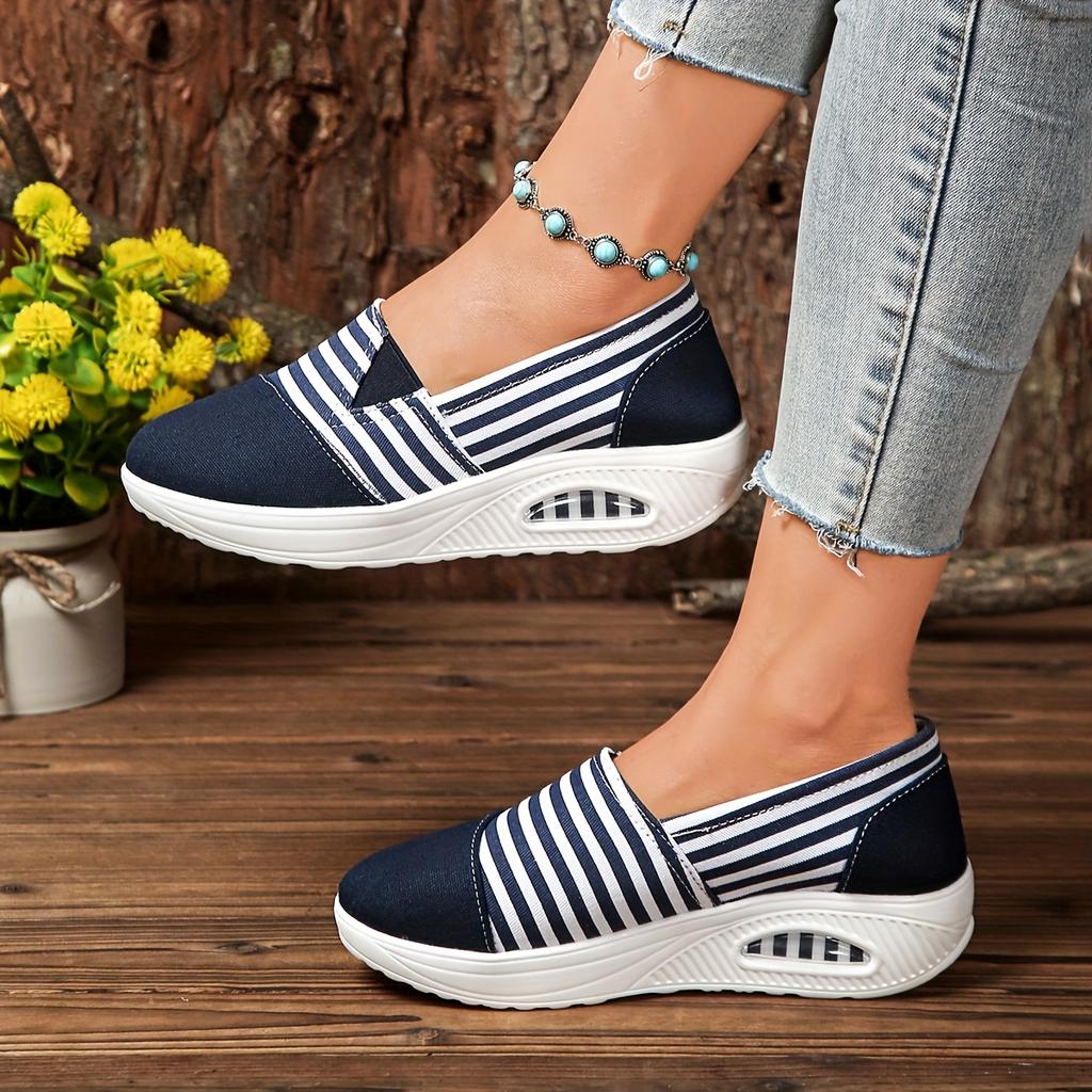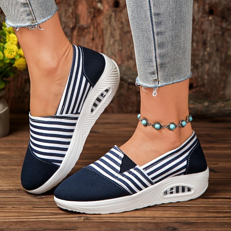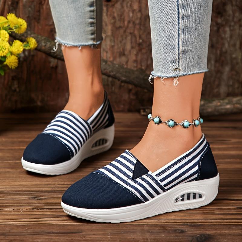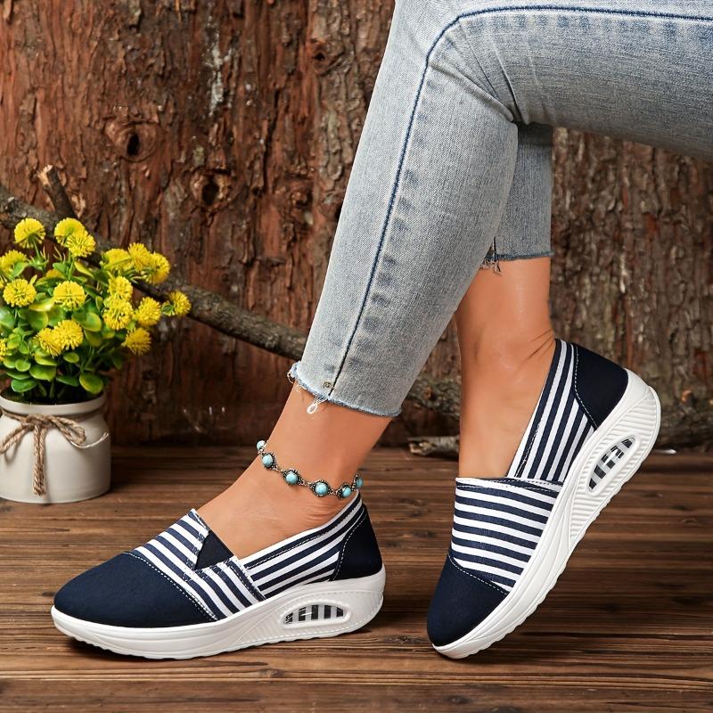 Прочные женские повседневные слипоны в полоску, низкие, с ремешком на щиколотке с бусинами, тканевый верх, подошва для всесезонной носки на открытом воздухе, удобная обувь