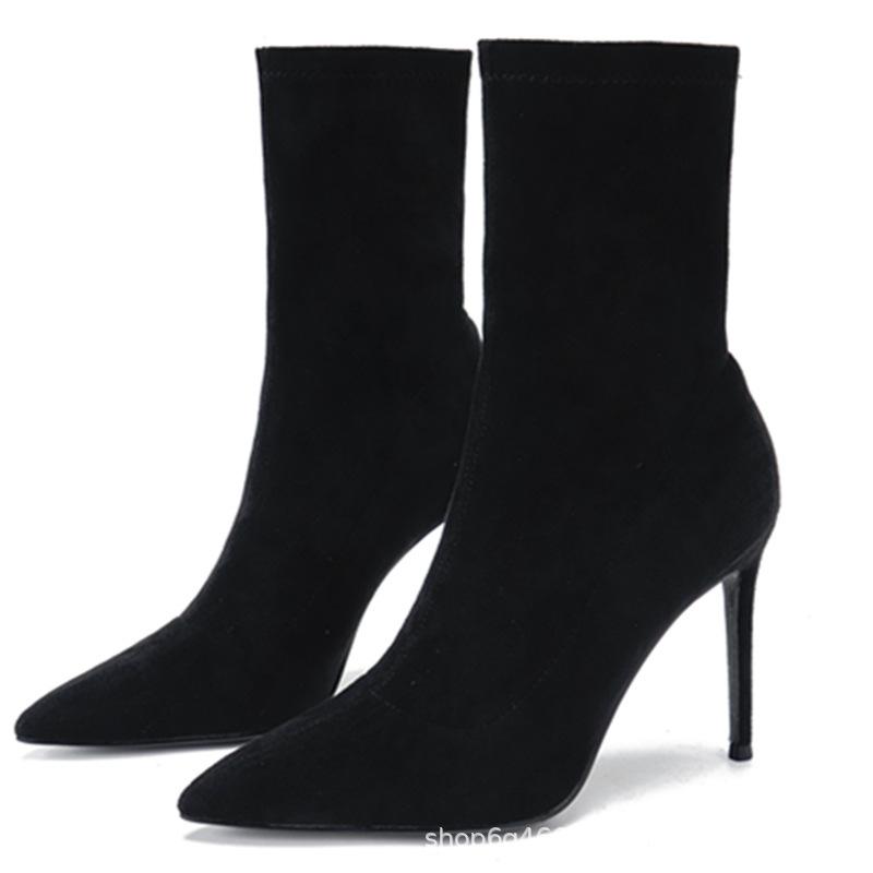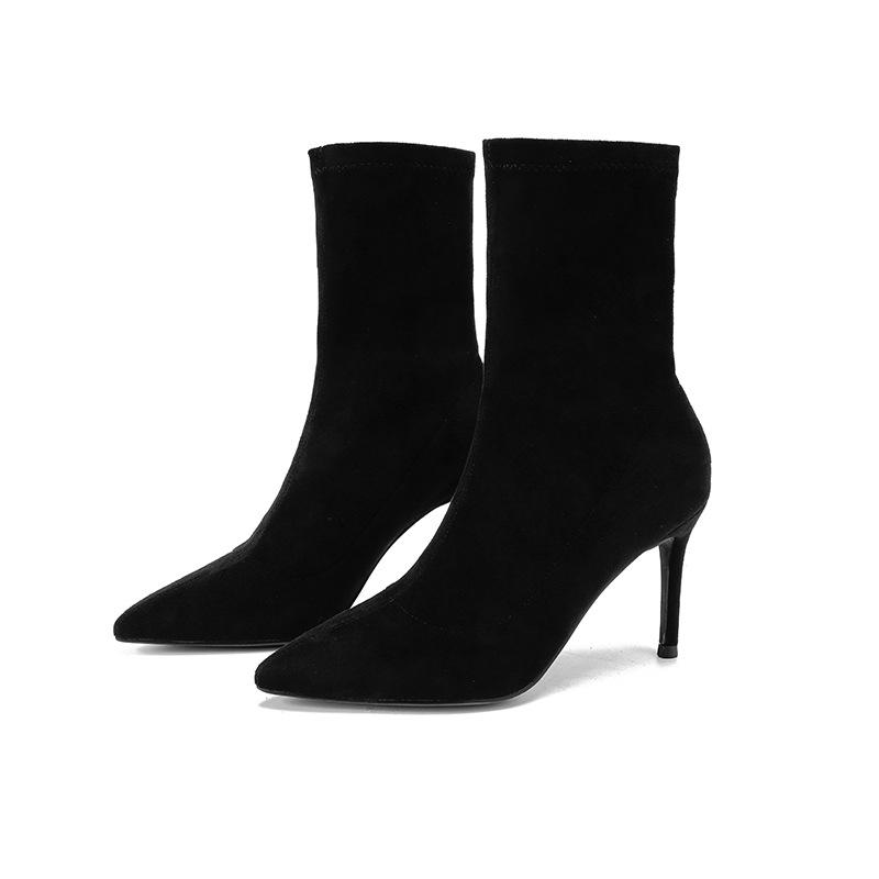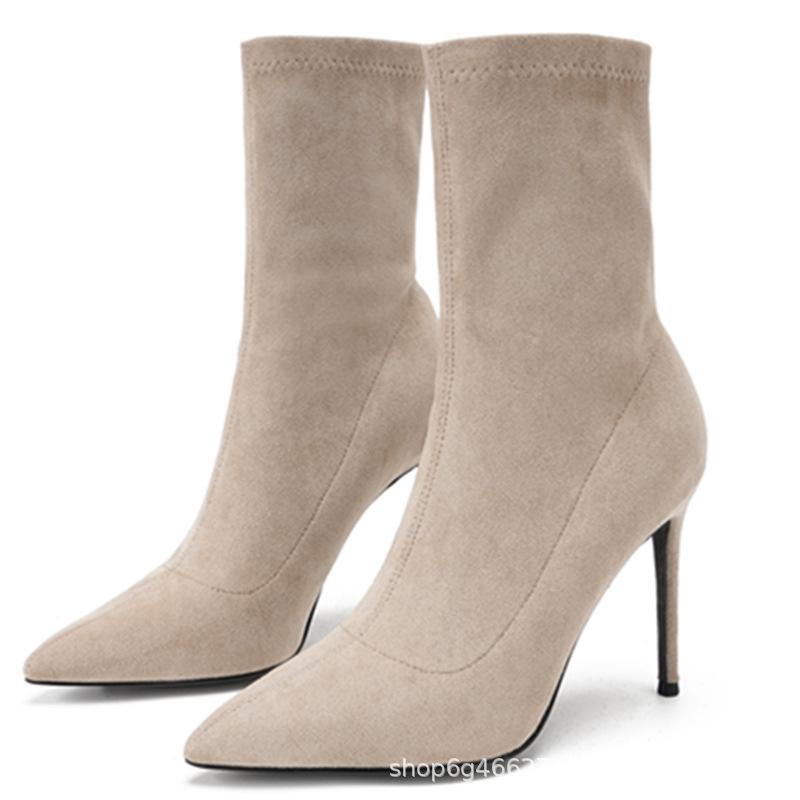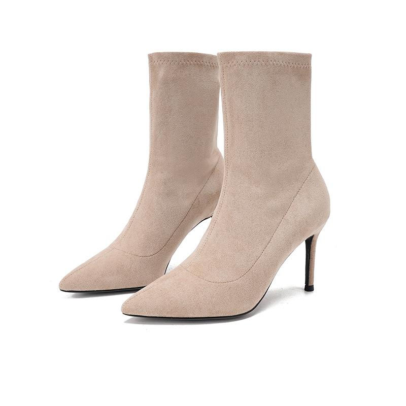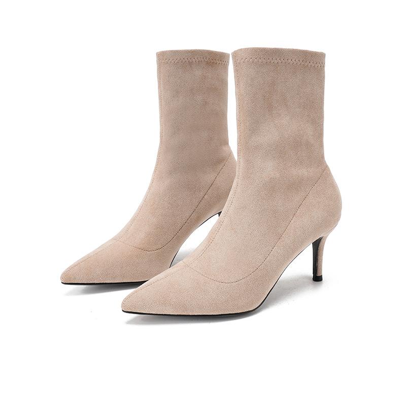 Осень и зима новые черные короткие ботильоны на высоком каблуке женские эластичные тонкие ботинки тонкий каблук острый носок универсальные короткие ботинки абрикосовые одинарные ботинки