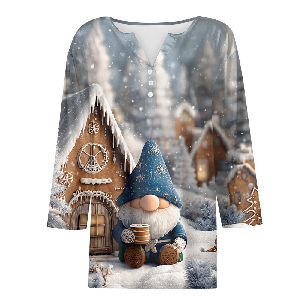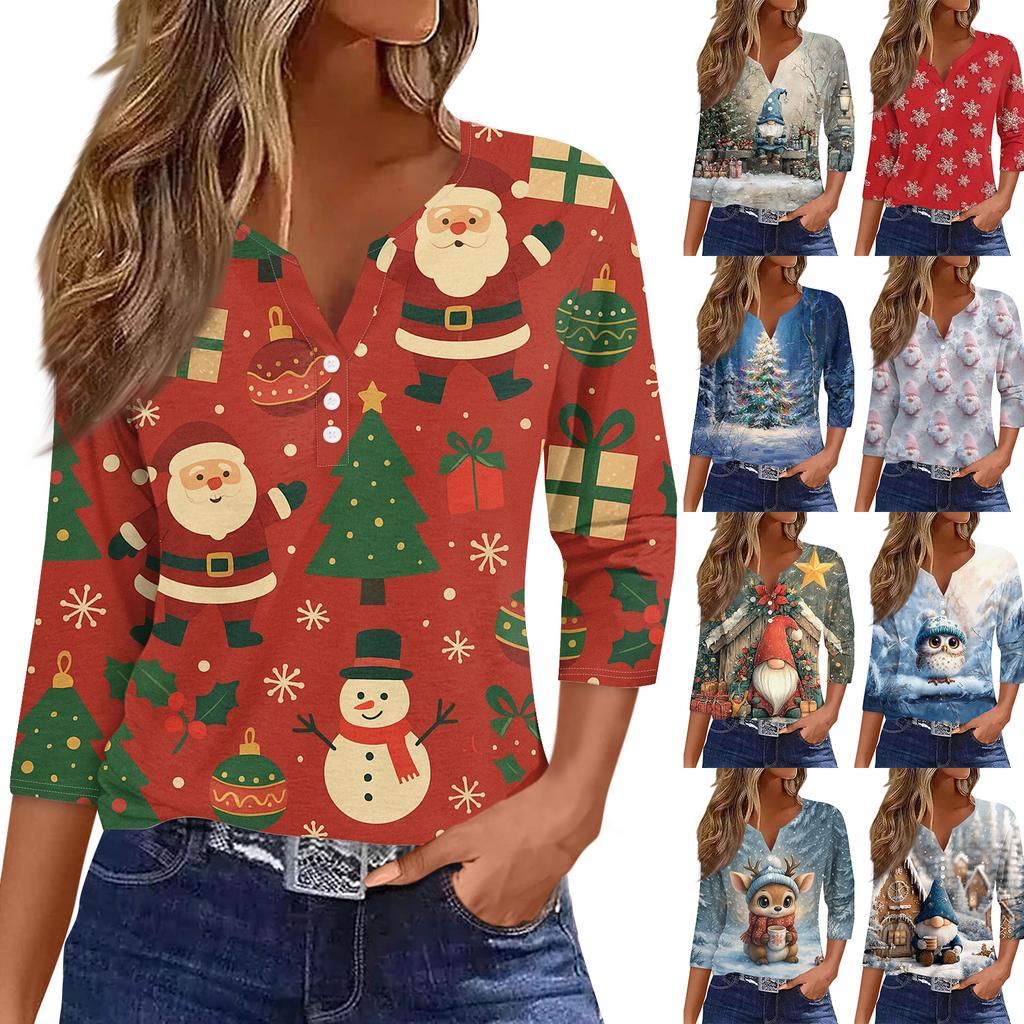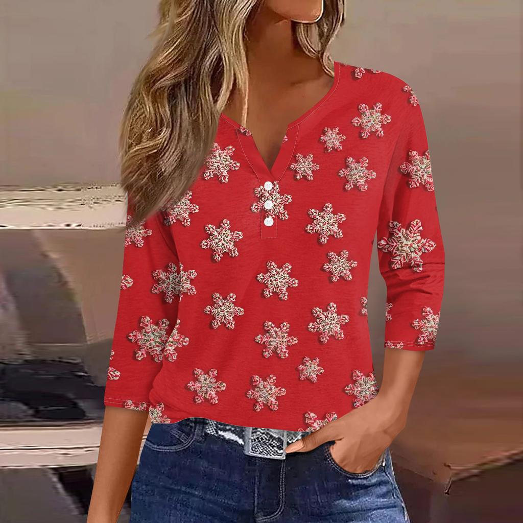 Женская модная повседневная футболка с V-образным вырезом, короткими рукавами, декоративными пуговицами и рукавами три четверти с рождественским принтом