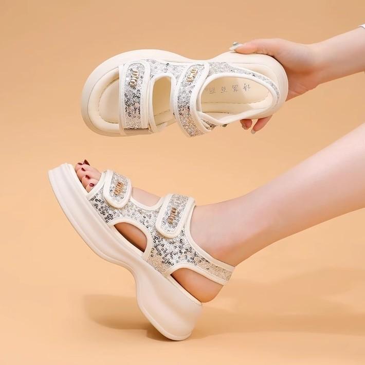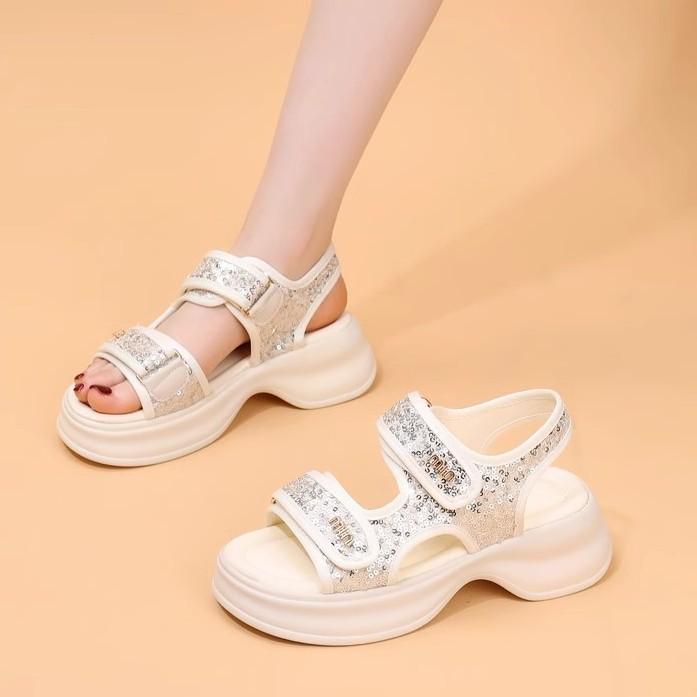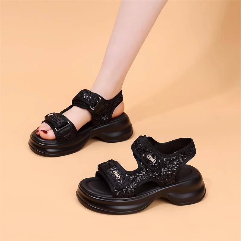 2025 летние спортивные сандалии женские новые увеличивающие рост маленький ароматный ветер липучка милые пайетки повседневные платформа пляжная обувь