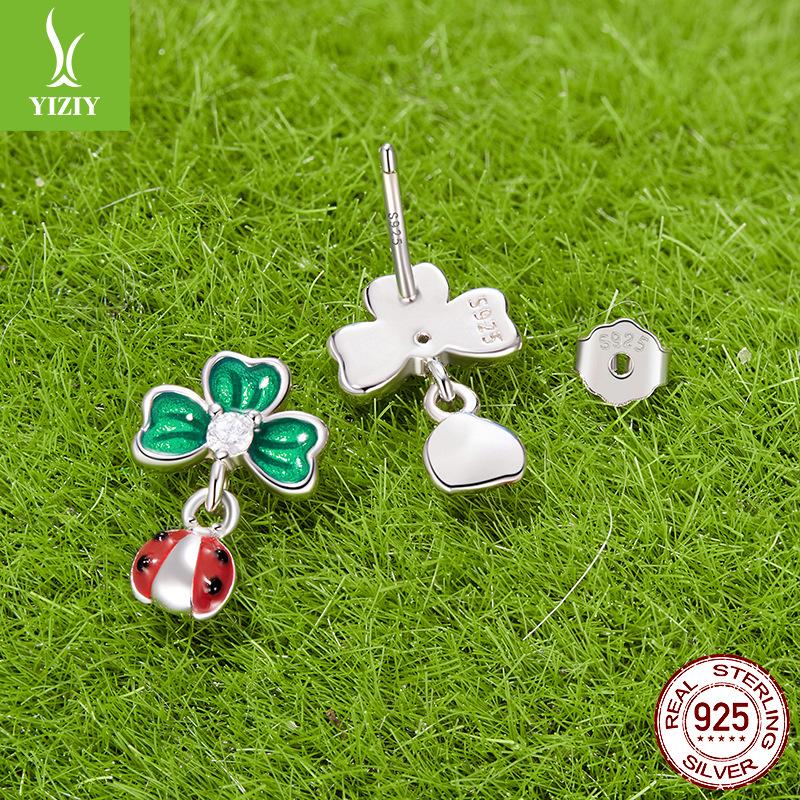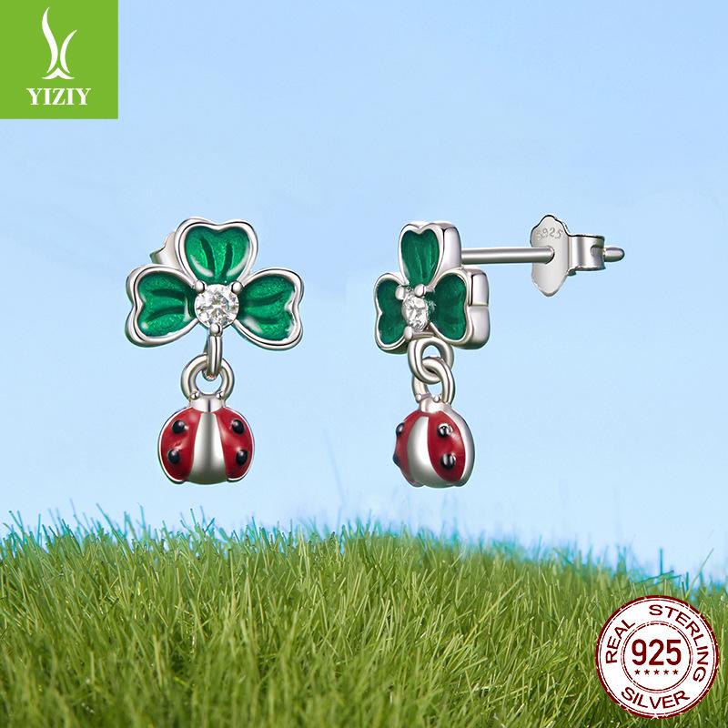 Серьги-пусеты «Четырехлистный клевер и божья коровка» женские, счастливые, натуральные, свежие, из стерлингового серебра 925 пробы