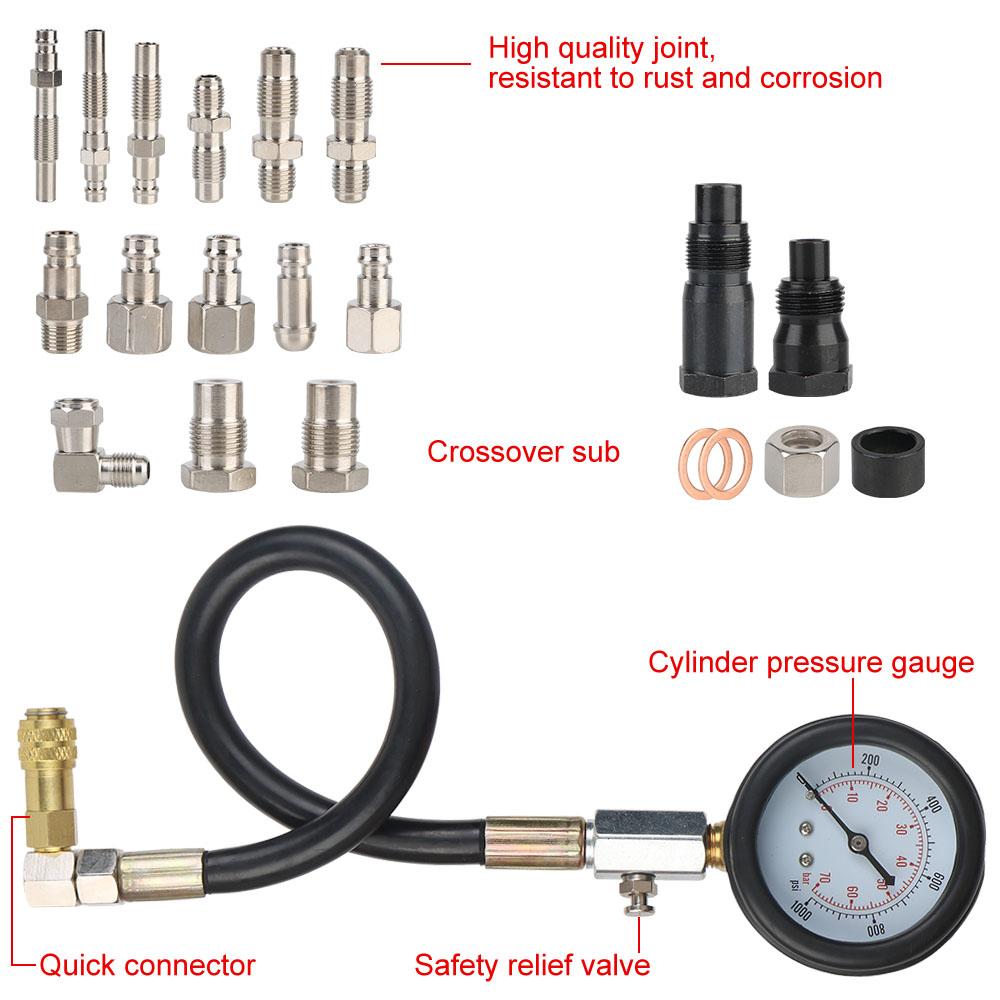 0-1000Psi TU-15A Манометр Набор диагностических инструментов Набор манометров 18 шт. Набор для проверки компрессии цилиндров дизельного двигателя Набор адаптеров