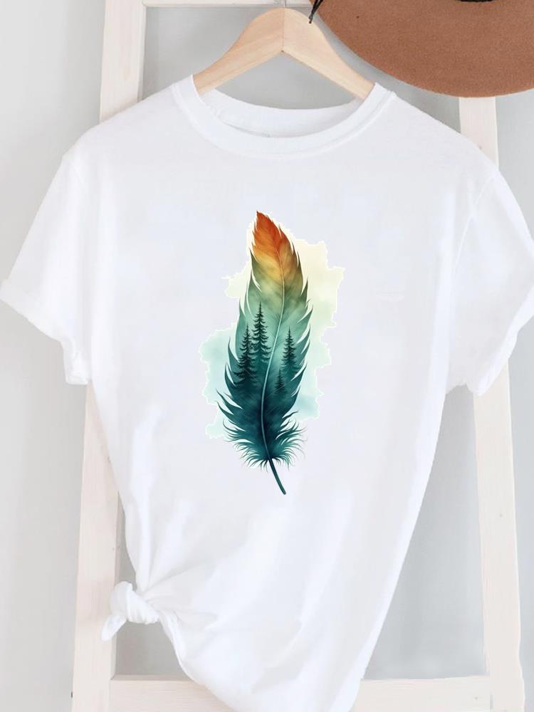 (Азиатский размер) Женский топ с коротким рукавом T Женский принт Мода для леди O-образный вырез перо трендовый стиль Повседневная одежда Графическая футболка Футболки