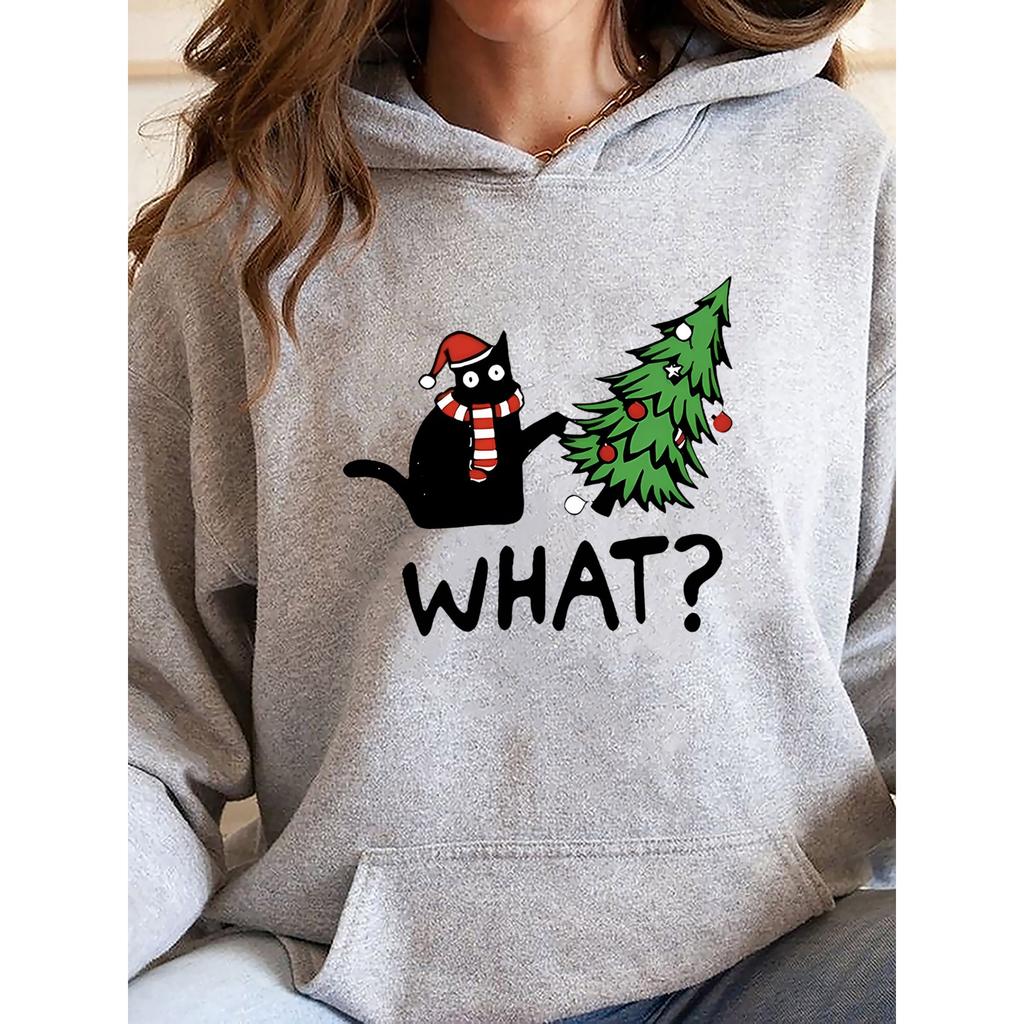 Женское праздничное худи с рождественским принтом кошки 2025 Женская толстовка Повседневная с длинным рукавом Осенне-зимнее теплое худи