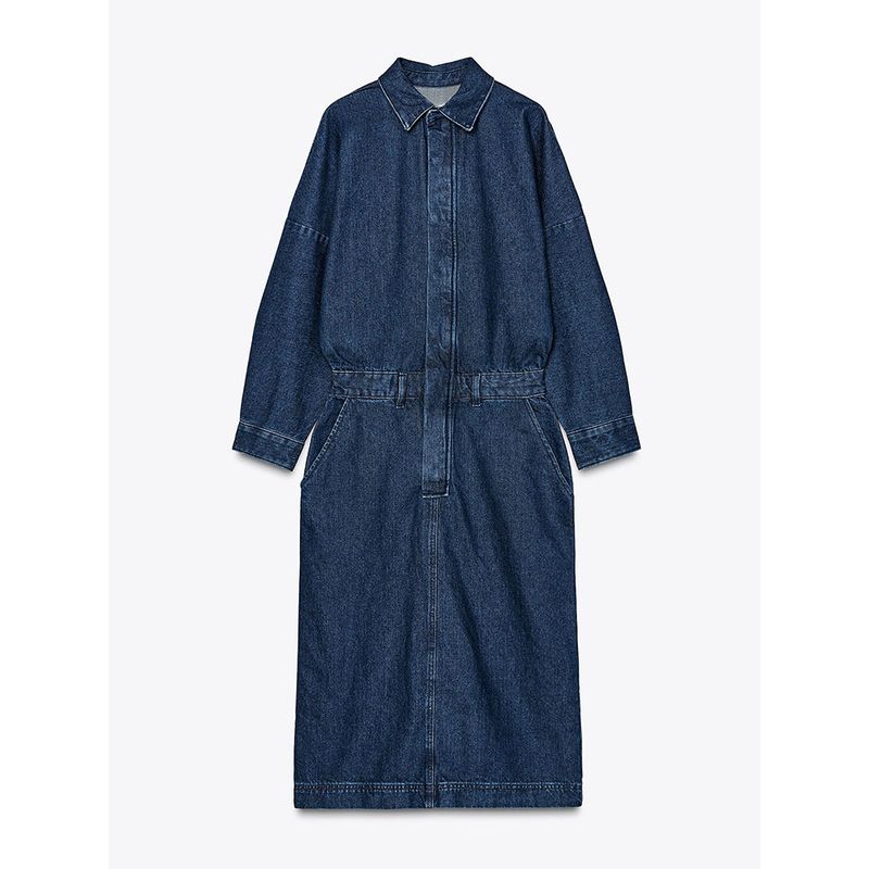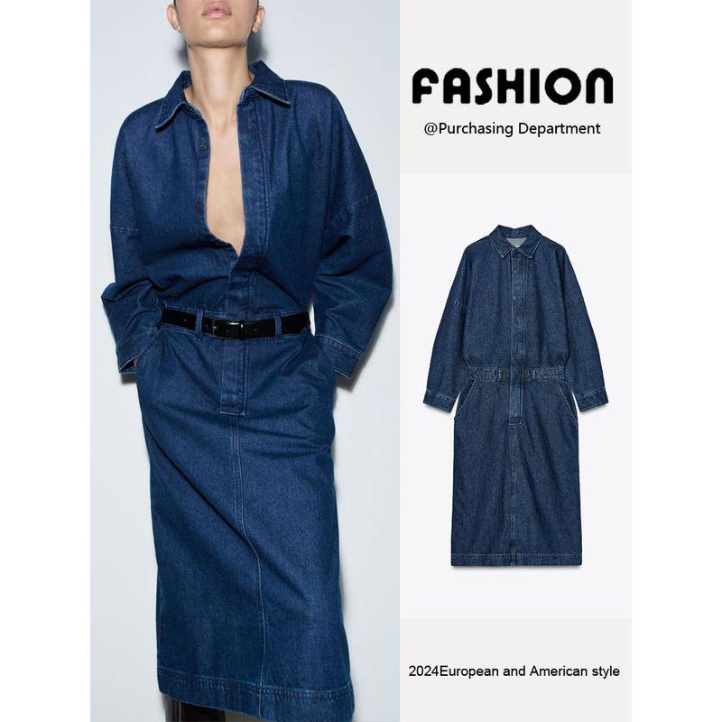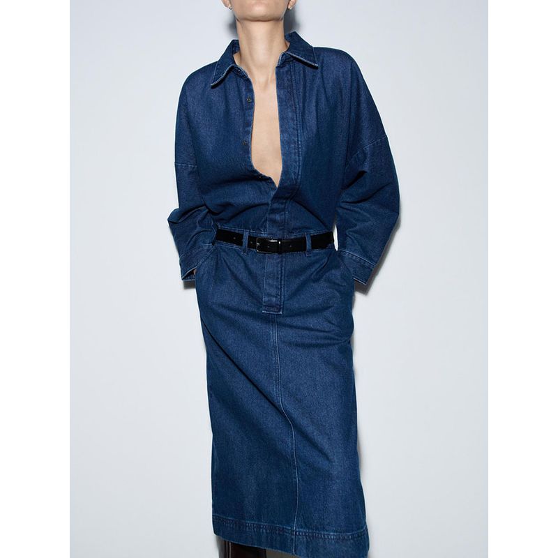 Za2025 Spring New Women's Clothing Temperament Leisure Loose Denim Long Sleeves Lapel Midi Skirt Dress 4441250