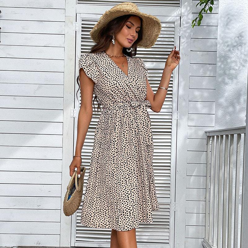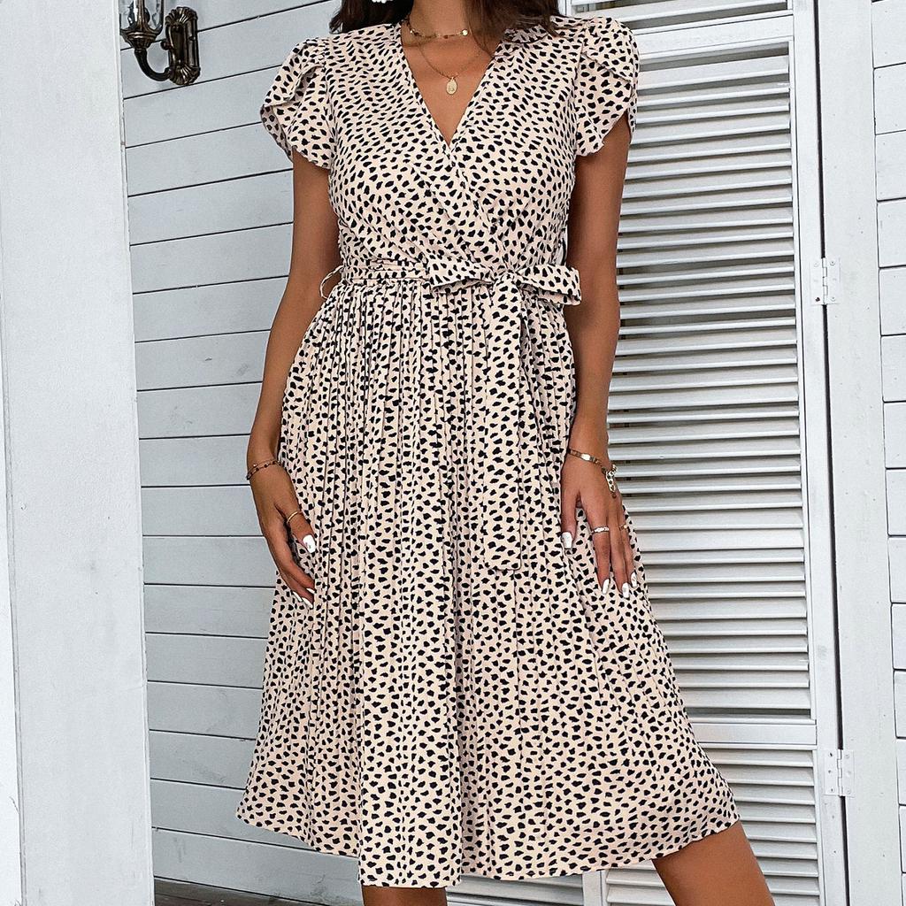 Женская мода лето-весна с леопардовым принтом повседневные платья с коротким рукавом и v-образным вырезом с высокой талией
