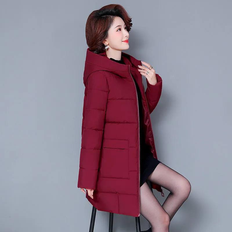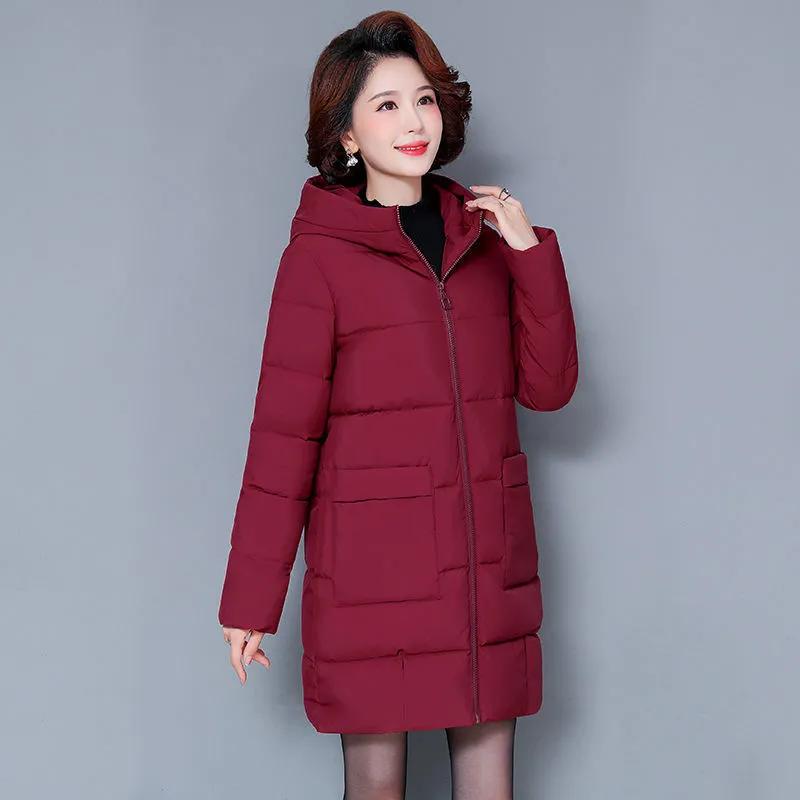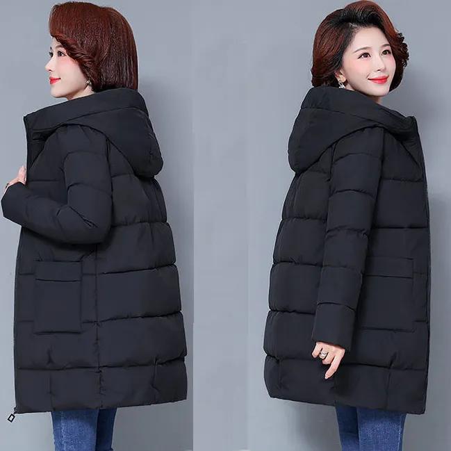 Женское зимнее теплое пальто с капюшоном большого размера однотонное средней длины простое пальто для женщин среднего и пожилого возраста