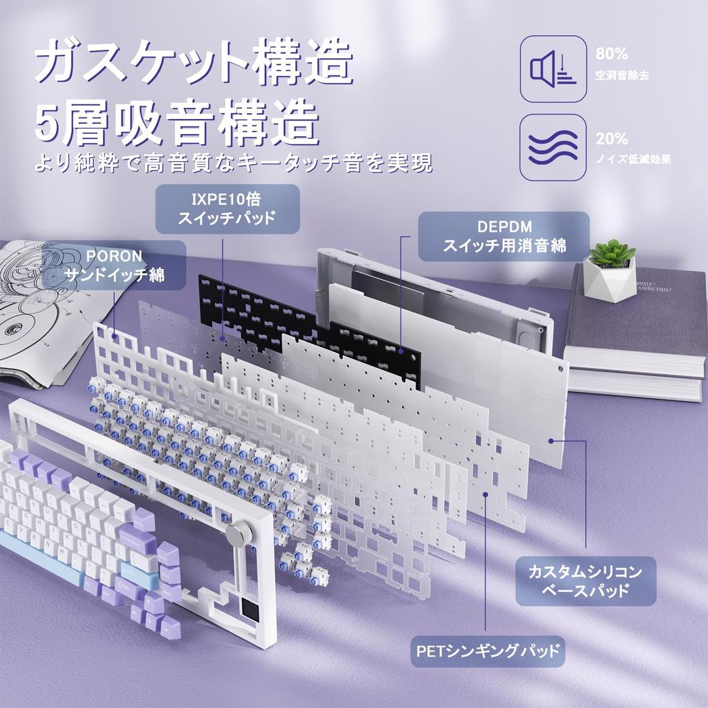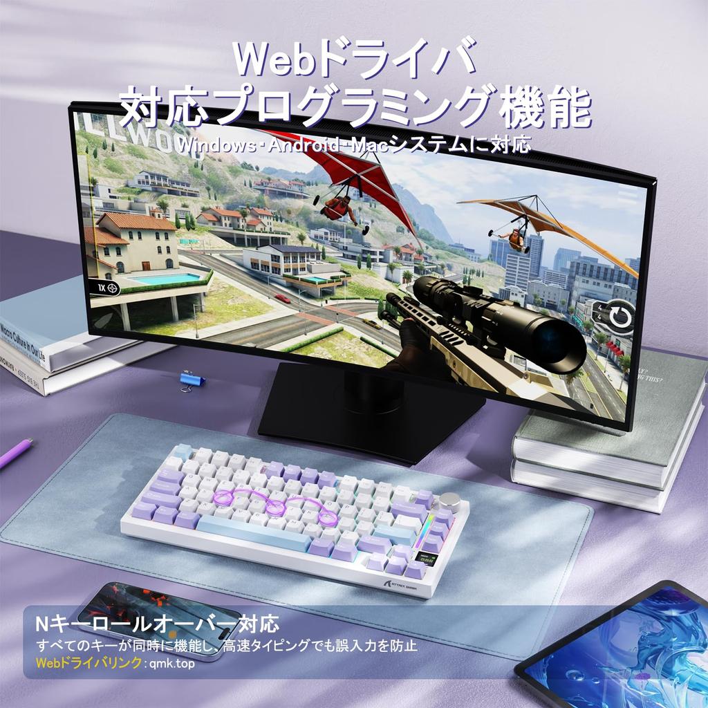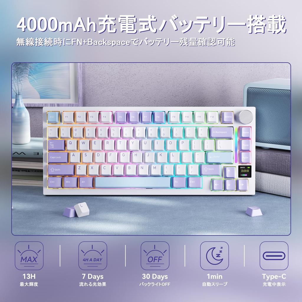 [RGB-подсветка и настраиваемый светодиодный ЖК-дисплей] Оснащен RGB-подсветкой, поддерживающей 16 миллионов цветов и 22 предустановленных режима освещения. Светодиодный матричный ЖК-экран является стандартным, что позволяет отображать не только английский, но также японский и другие языки.. Используя специализированное веб-программное обеспечение, вы можете отобразить любое изображение или анимированный GIF на ЖК-экране, создав уникальную клавиатуру.. Аккумулятор высокой емкости 4000 мАч обеспечивает длительное и стабильное использование даже при использовании RGB-подсветки и ЖК-экрана. Эта клавиатура идеально подходит для пользователей, которые ценят как дизайн, так и функциональность.