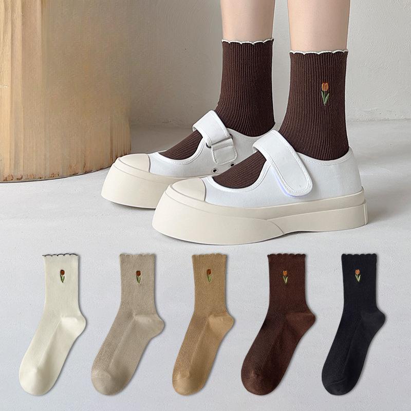 Женские весенне-летние хлопковые носки до середины икры с вышивкой в виде тюльпанов — купить товар онлайн с бесплатной доставкой по всему миру!