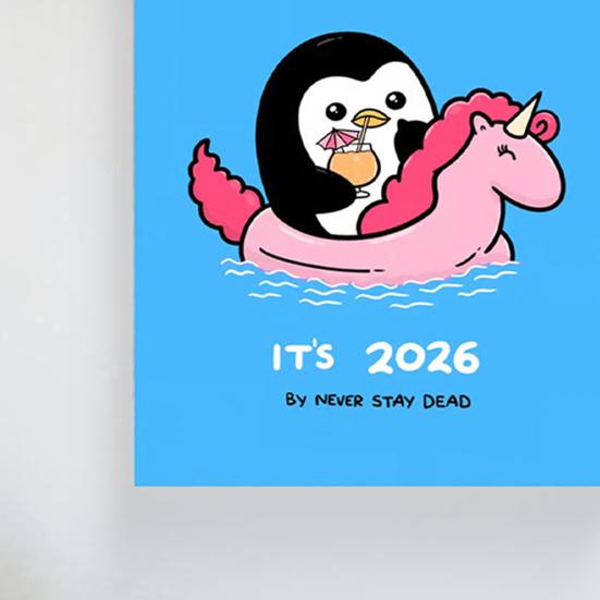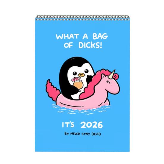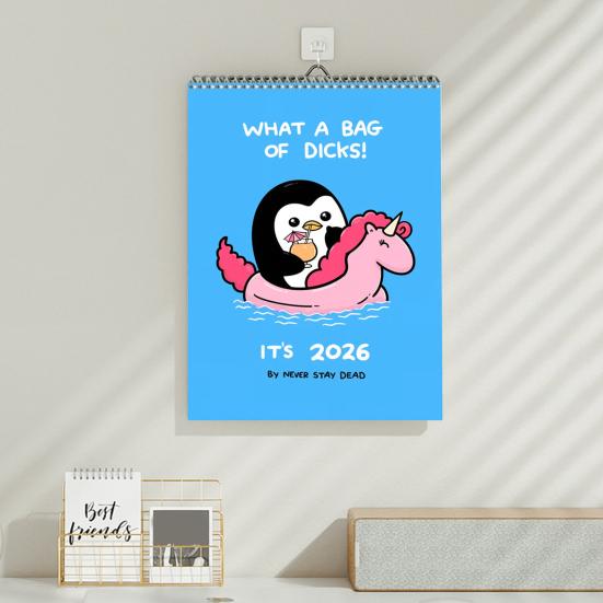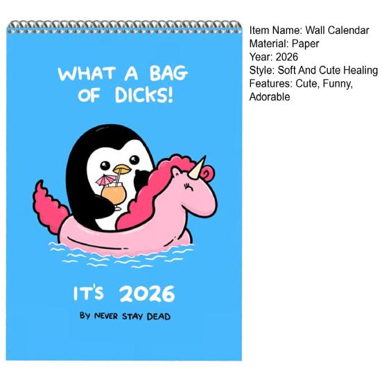 Представляем наш высококачественный настенный календарь из мелованной бумаги, с яркими цветами и смелыми дизайнами, чтобы каждый месяц украшать ваше пространство.. Центральным элементом является очаровательный пингвин на плавучей кровати в форме розового животного, создающий милую и полную воображения экспозицию, которая приносит радость.. Юмористические элементы календаря с фразами вроде "ЧТО ЗА МЕШОК С ЧЛЕНАМИ!" и "ЭТО2026," добавьте игривый штрих, сочетая остроумие и предвкушение наступающего года.