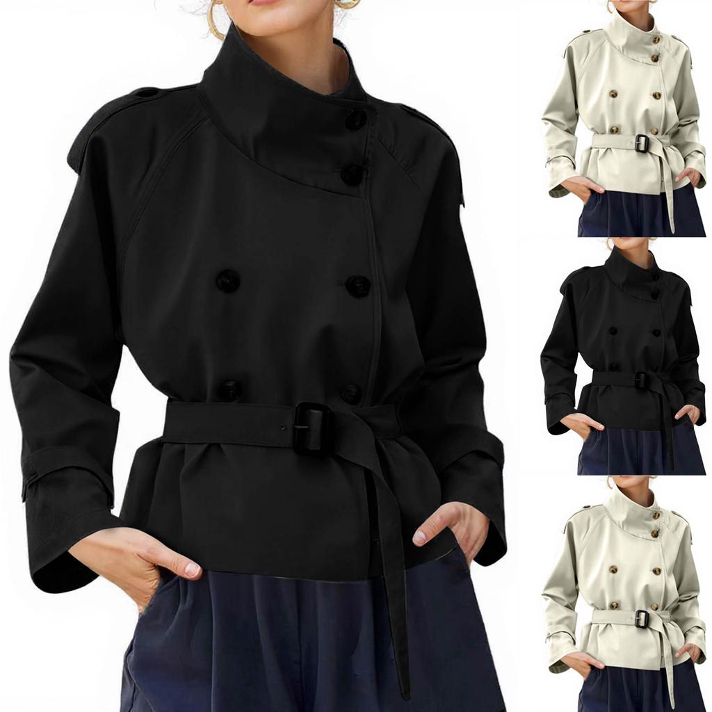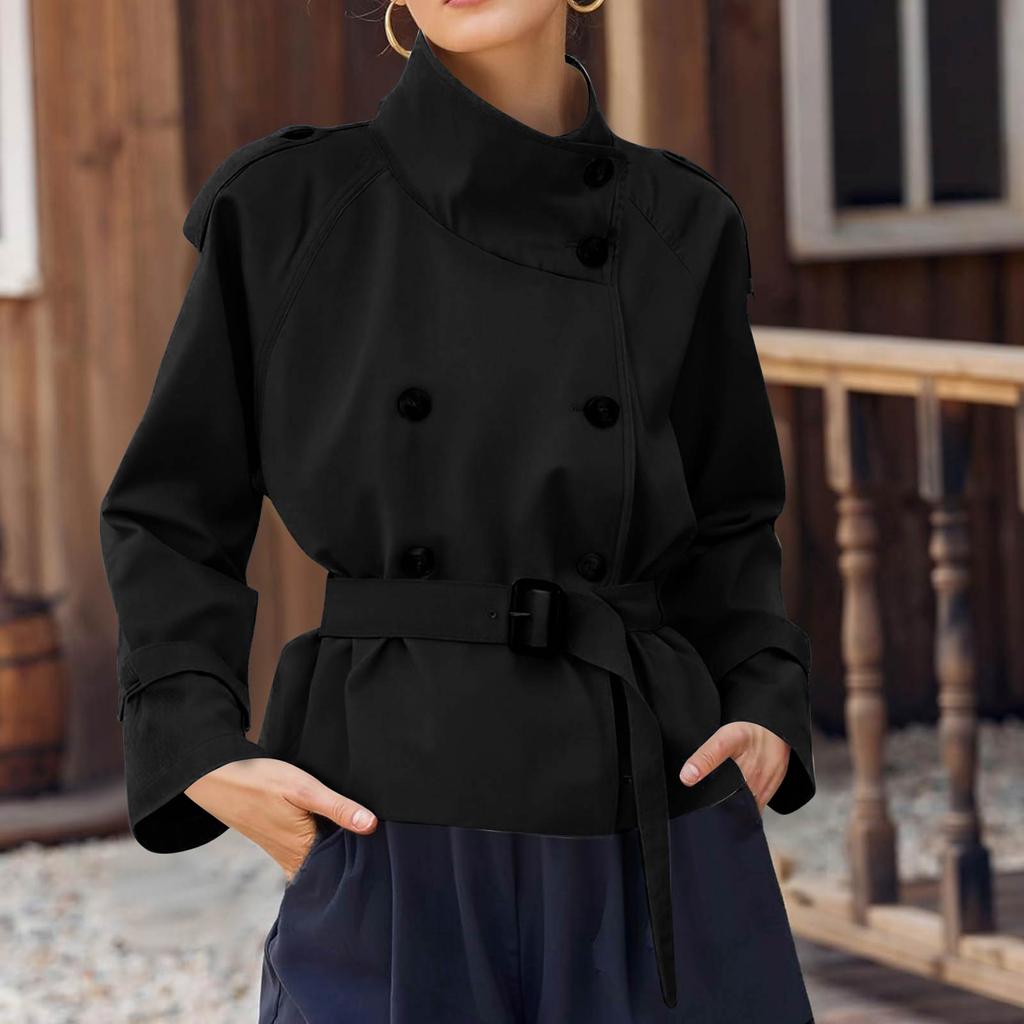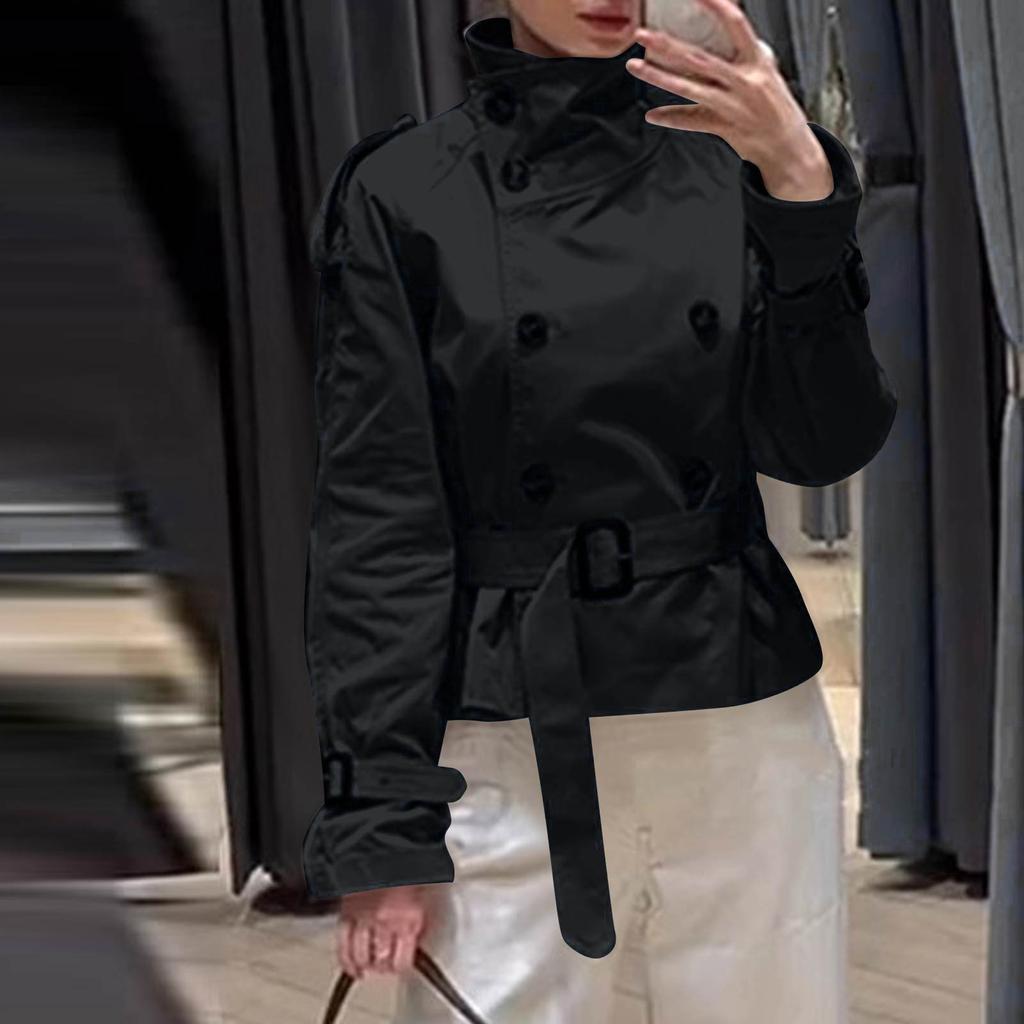 Женский модный короткий тренч с воротником-стойкой, двубортный, с поясом, подчеркивающим талию