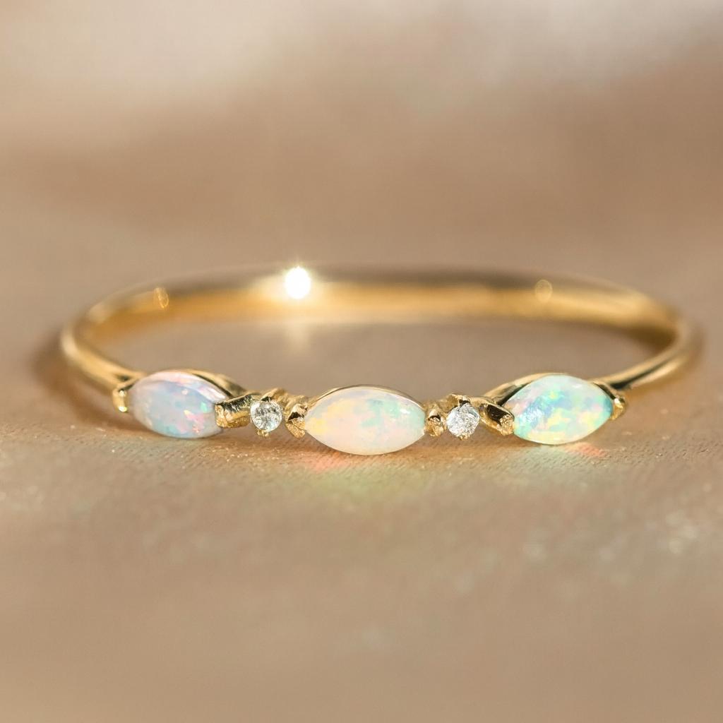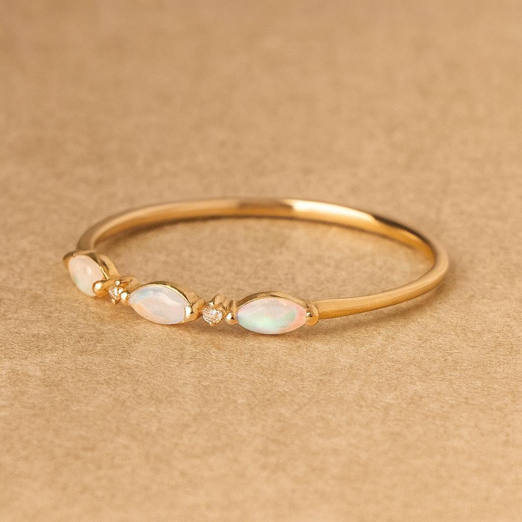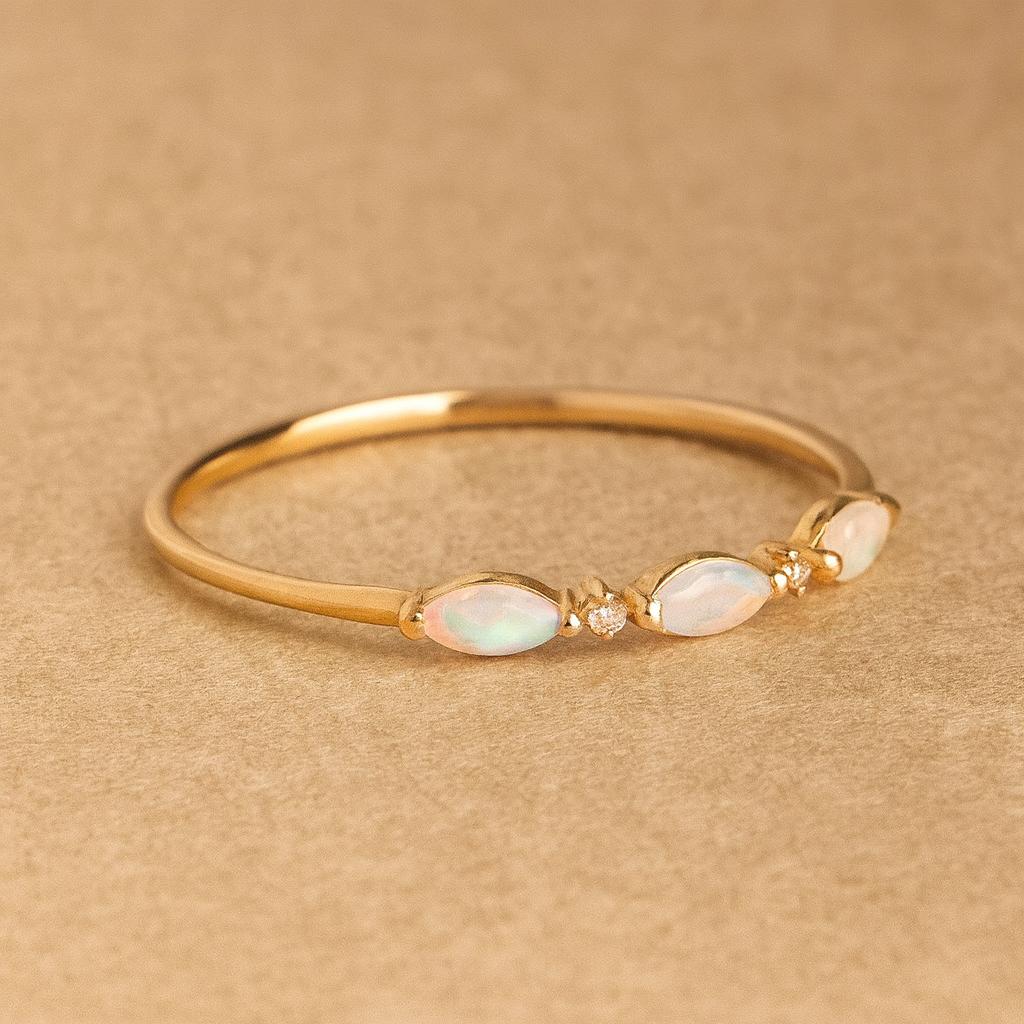 Женское изящное опаловое кольцо с позолоченной шинкой – опалы огранки «маркиза» с акцентами из кубического циркония, нежное штабелируемое украшение, подарок для нее