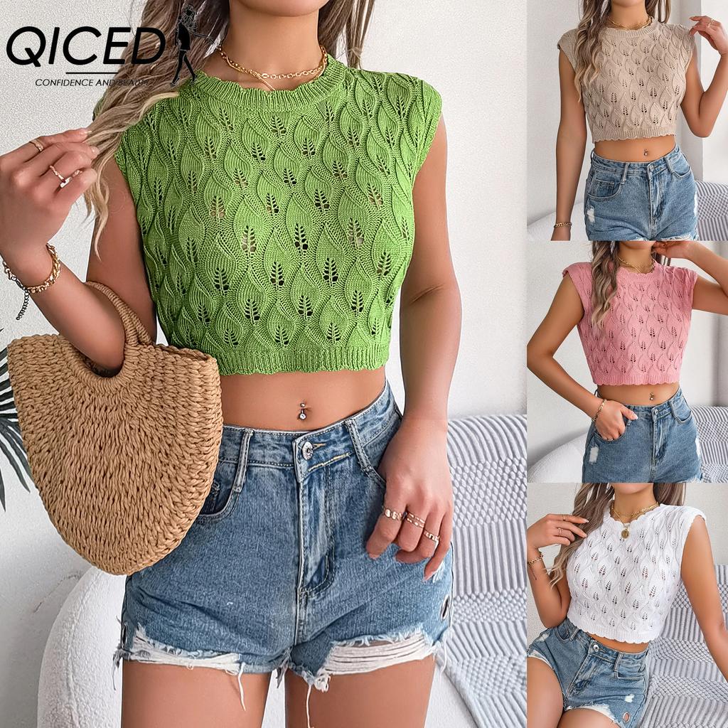 QICED Spring Summer Hollowed-out Leaf Crop Crop Knit Top for Women's Vacation — купить товар онлайн с бесплатной доставкой по всему миру!