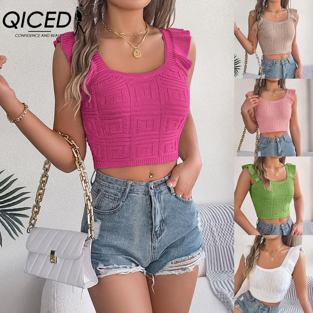 QICED Весна Лето Однотонный Квадратный Вырез Черная Отделка Ушками Без рукавов Вязаный Свитер Кроп-топ Женская Одежда
