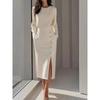 2025 European and American Autumn Temperament Solid Pleat Waist Hugging round Neck Cut-out Dress Women clothes