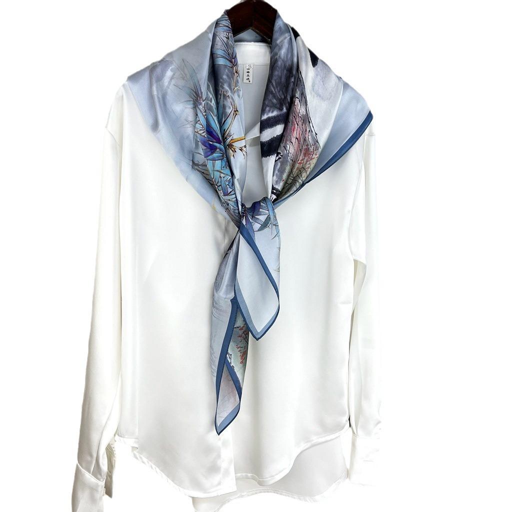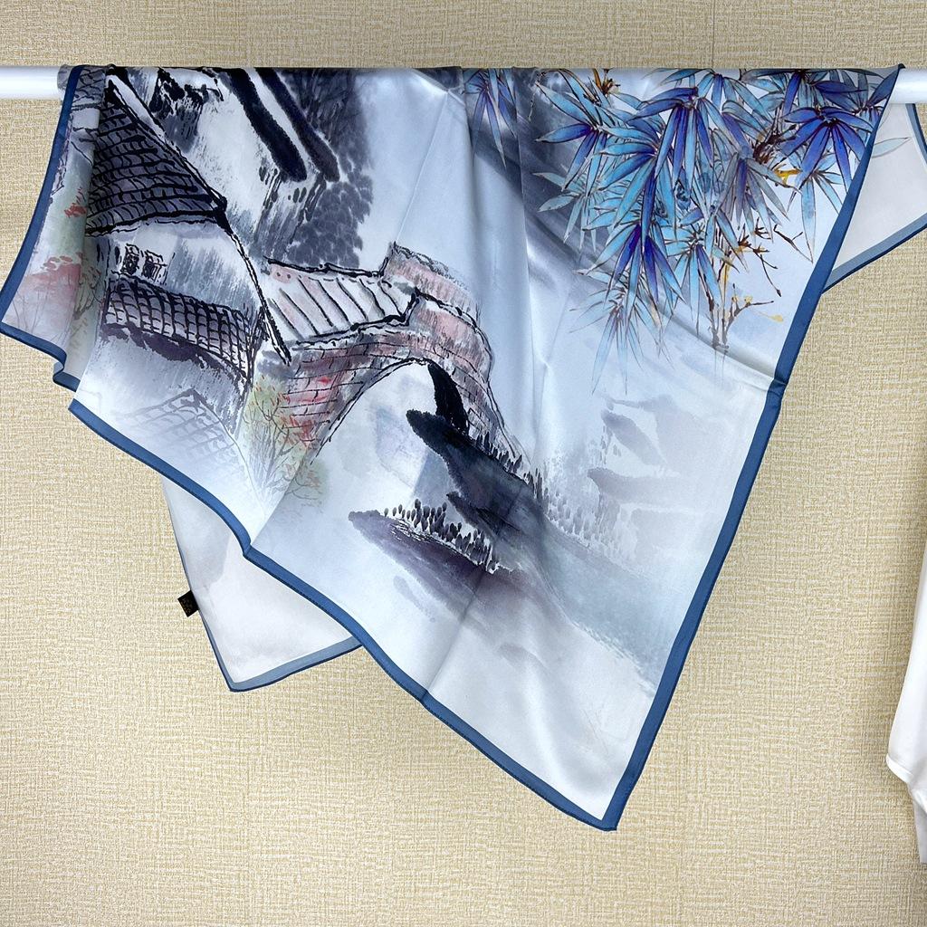Цзяннаньский водный городок Сучжоу Тушь Живопись Шелковый шарф Женский Универсальный Китайский ветер Сяоцяо Текущая вода Тутовый шелк Шелковый платок Квадратный платок