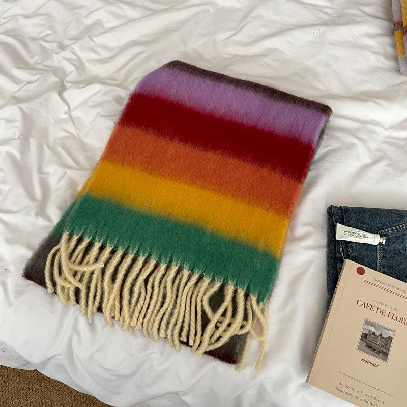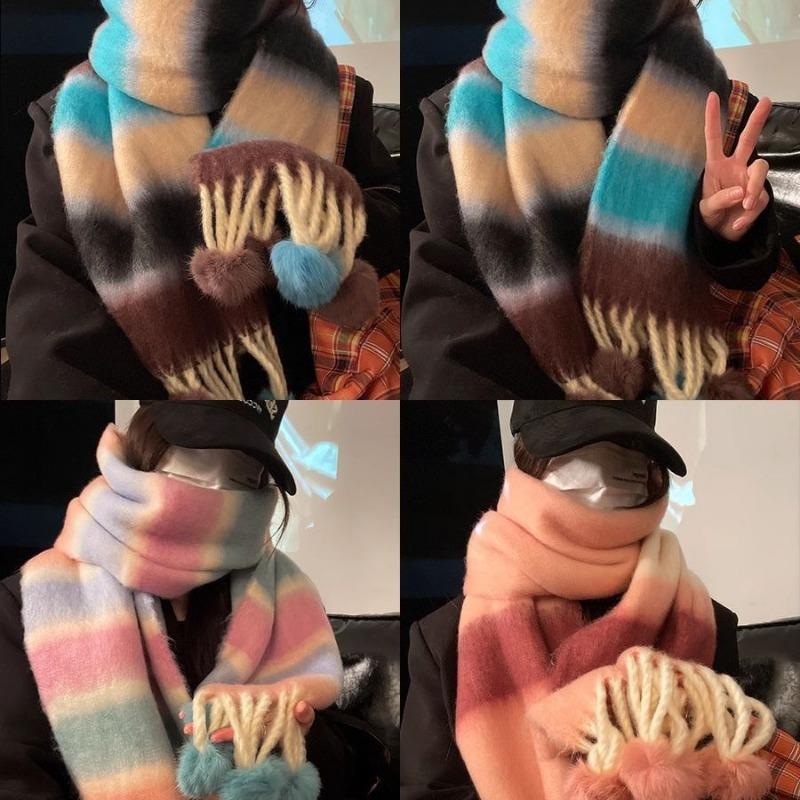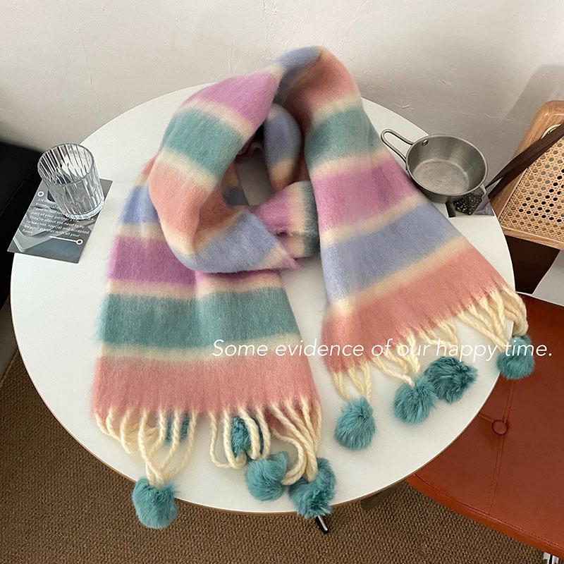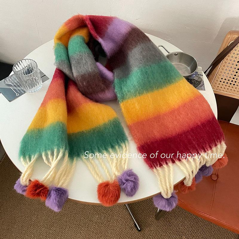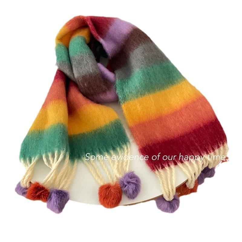 Радужный полосатый шарф Женский премиальный универсальный шарф с кисточками и помпонами Теплый шарф Рождественская атмосфера
