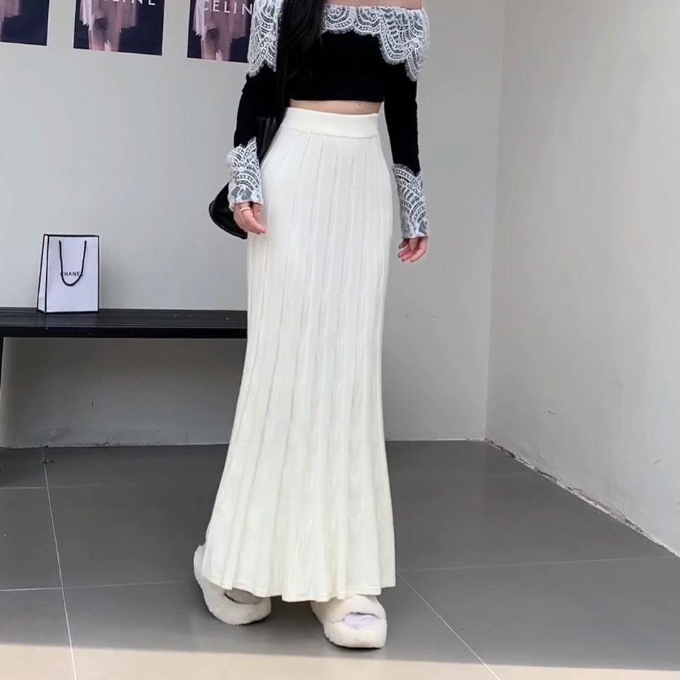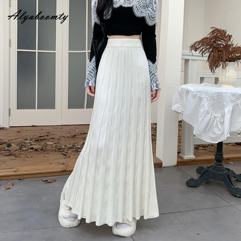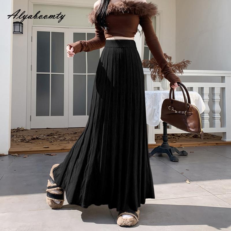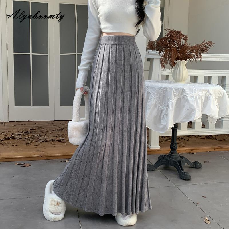 Корейская мода Осень Зима Женская Макси Длинная Юбка с Завышенной Талией Черная Бежевая Серая Вязаная Плиссированная Юбка Теплая Вязаная Элегантная Юбка