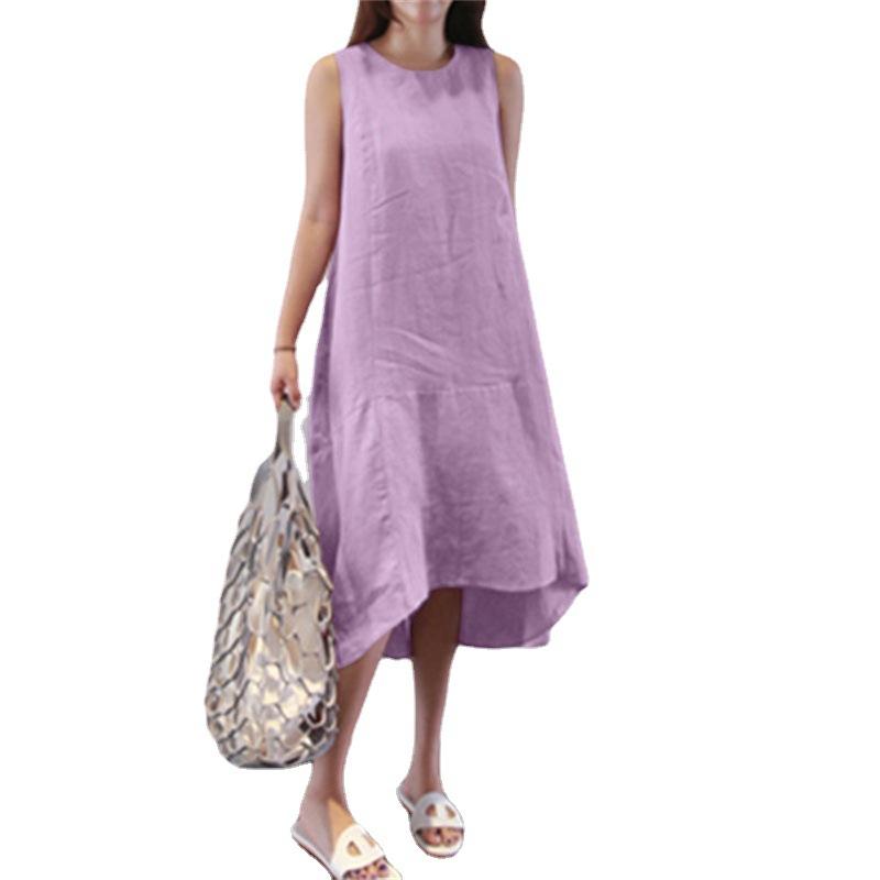 Летнее женское платье с круглым вырезом, длинным рукавом, больших размеров, свободное однотонное длинное длинное платье, большой жилет, хлопково-льняные платья