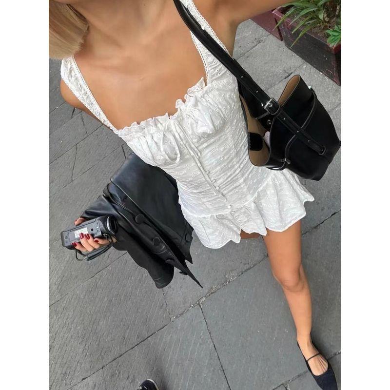 Белое милое романтичное платье-сарафан для первого свидания в стиле французской суперфеи, облегающее, с завышенной талией, вышивкой и квадратным вырезом