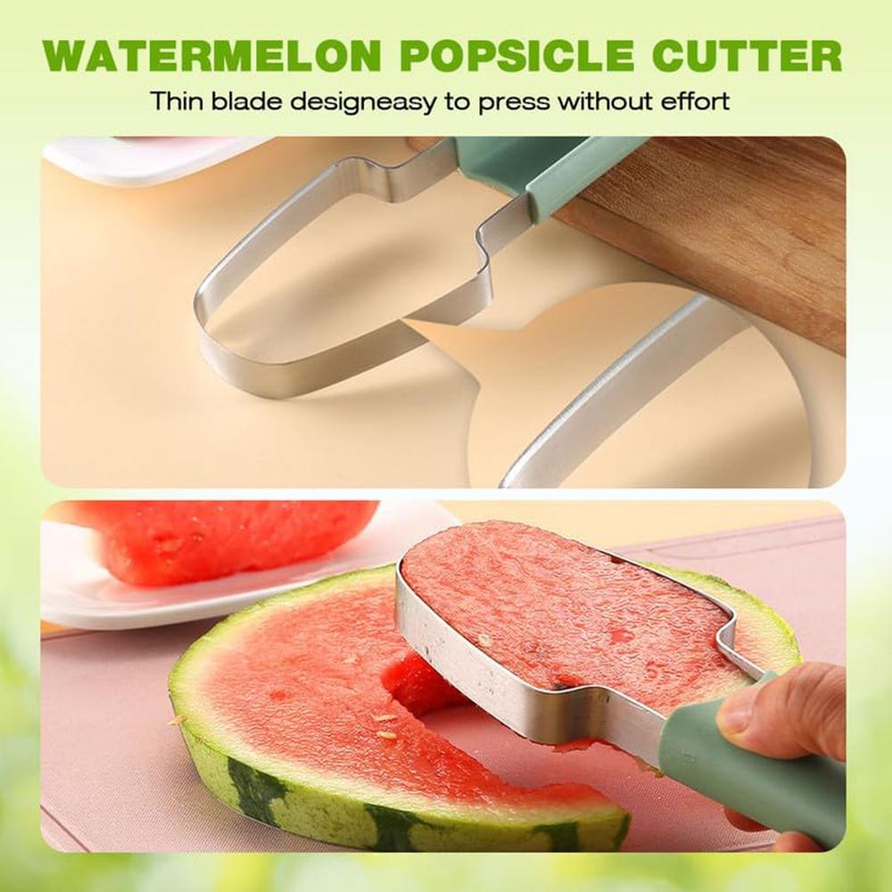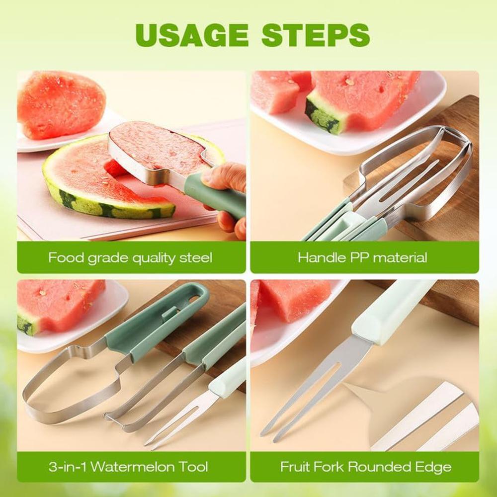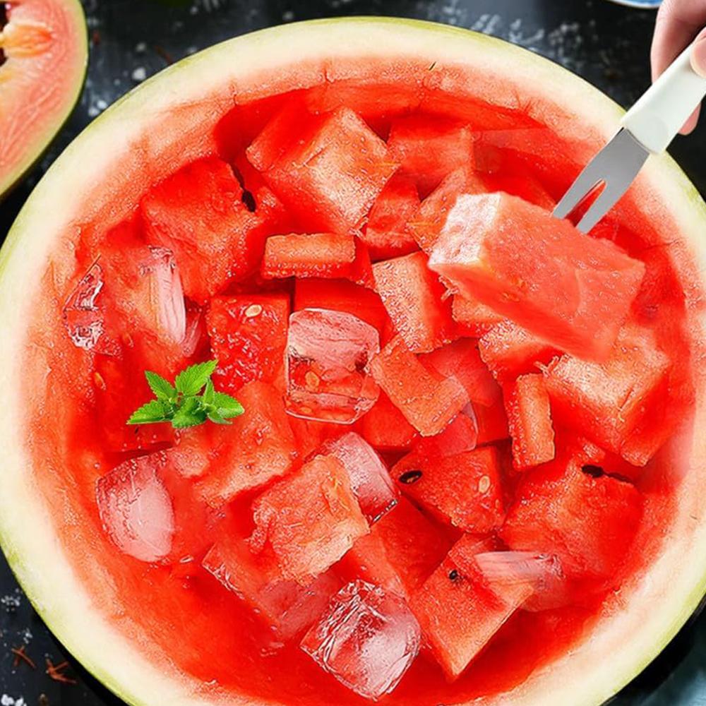 Инструмент для нарезки арбуза состоит из вилки, резака для арбуза и формы для арбузного эскимо, вы можете легко нарезать и подать арбуз, полностью удовлетворяя ваши потребности в поедании арбуза, позволяя вам наслаждаться арбузом с удовольствием без вытекания сока.