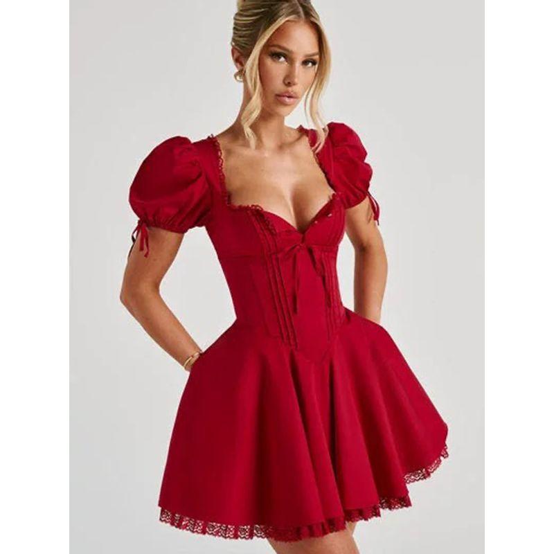 Ballet Hymn Babyboo French style Sweet Red Square Collar Lace Waist Hugging Slimming Puff sleeve Dress