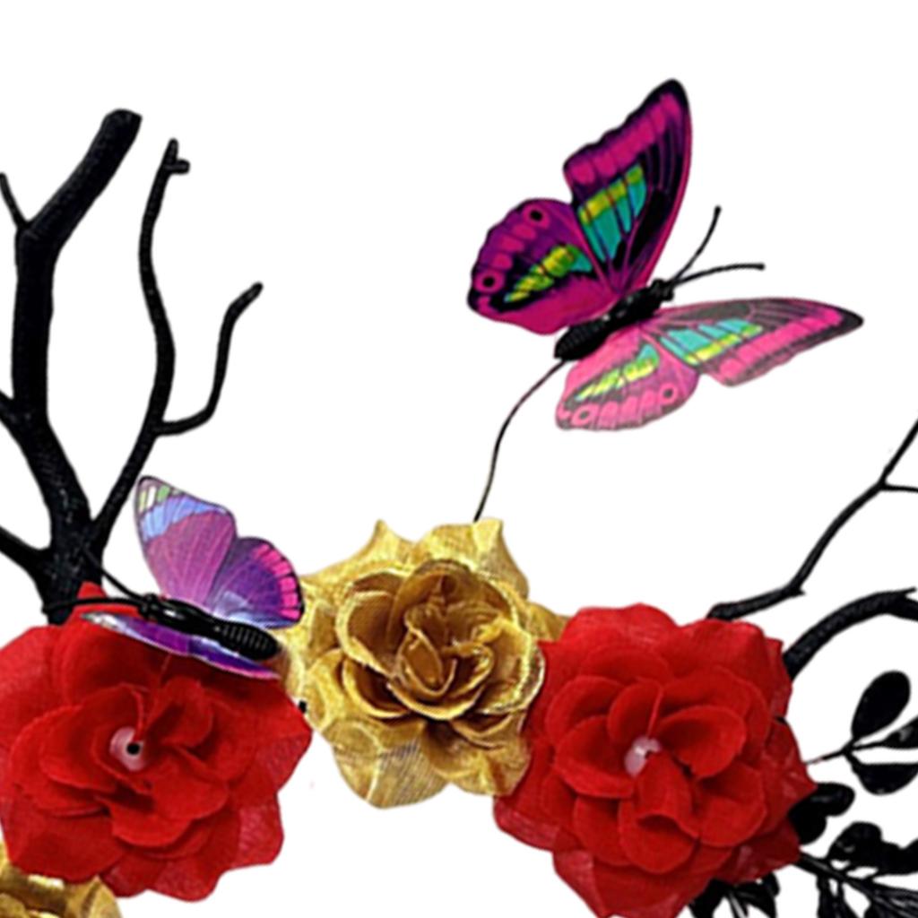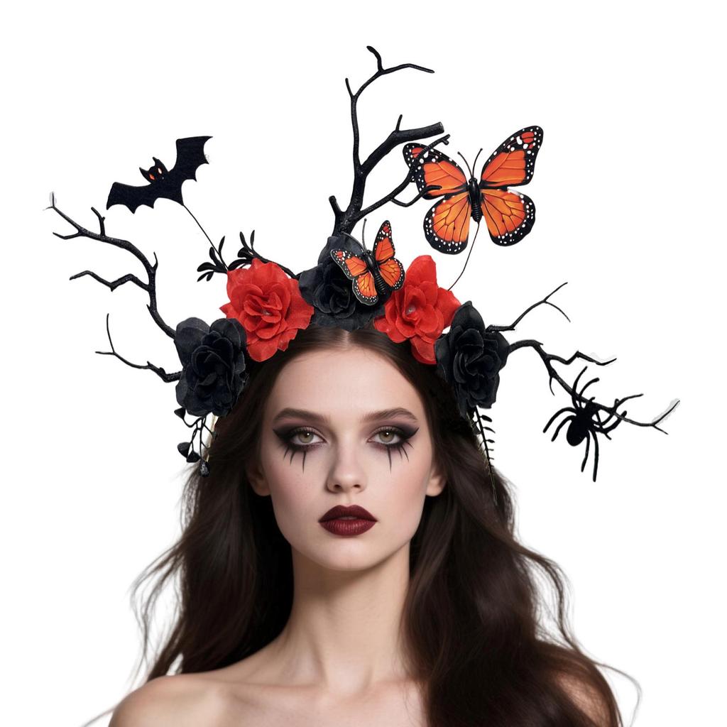 Хэллоуин Ободок с оленьими рогами с деталью летучей мыши и бабочки и черным цветочным украшением для волос для костюмированных вечеринок