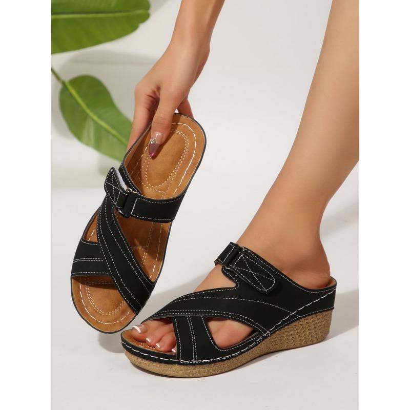 Большой размер, шлепанцы на танкетке, женские летние новые сандалии с перекрестными ремешками на липучке, цветной коллаж