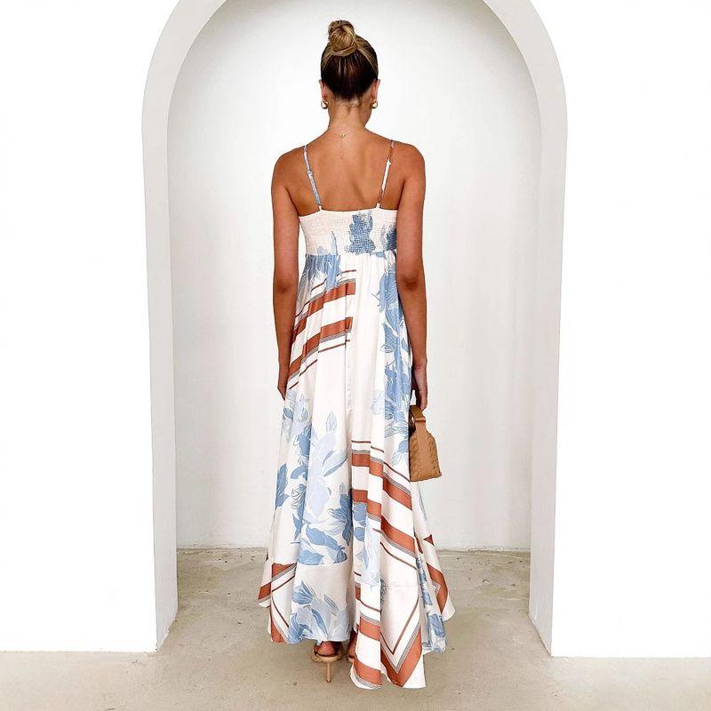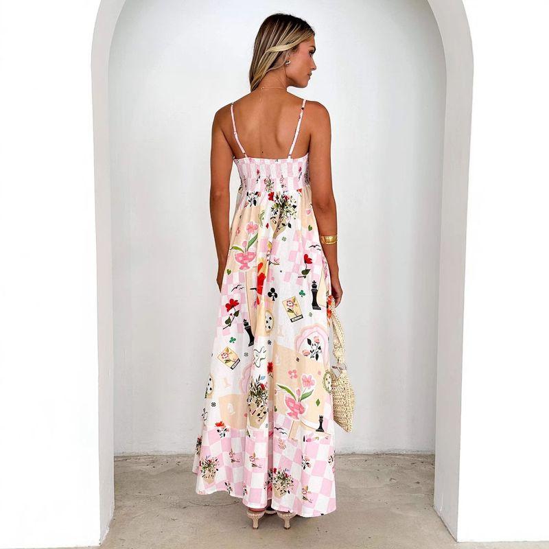 2025 Европейская и американская летняя мода, принт, открытая спина, на бретелях, сексуальное, с большим подолом, платье с высокой талией для женщин