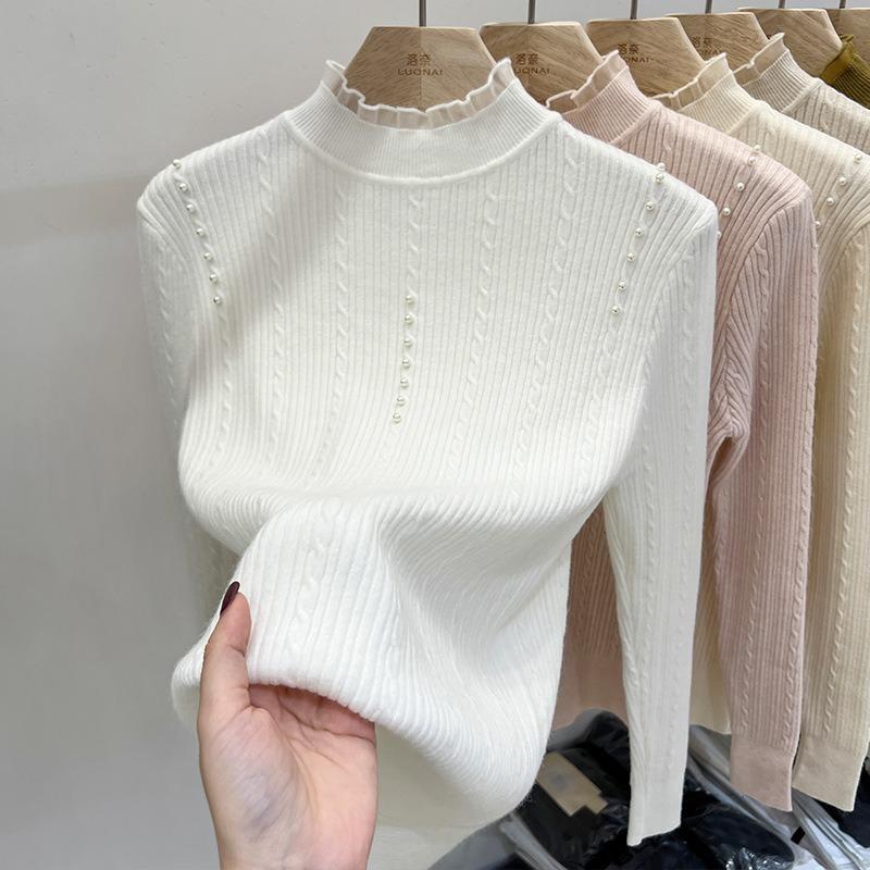 Осень и зима новый трикотажный топ-основа с полувысоким воротником, женский модный тонкий свитер с жемчугом и косами для ношения под одеждой — купить товар онлайн с бесплатной доставкой по всему миру!