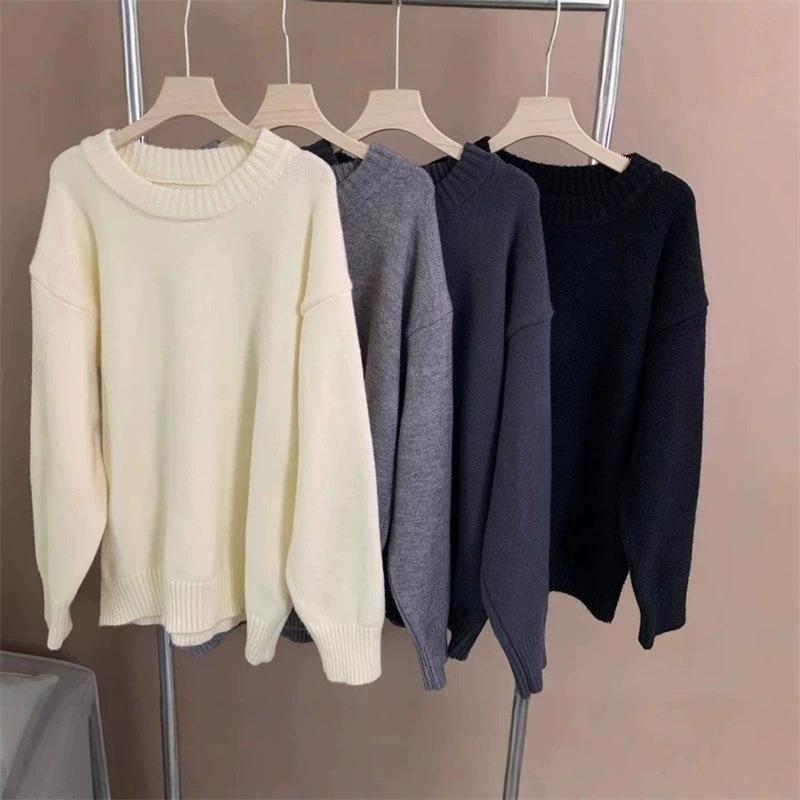 Осень и зима новый однотонный простой и универсальный пуловер с круглым вырезом женский большого размера свободный внутренний вязаный свитер