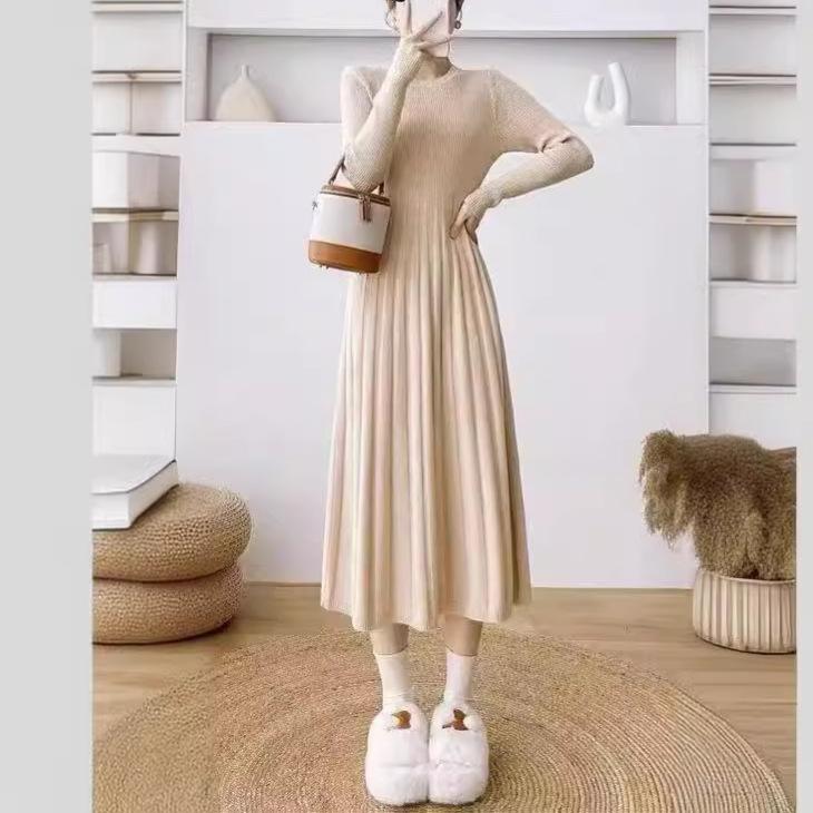 Осень и зима новый повседневный модный внутренний свитер юбка однотонный круглый вырез до колена длинное вязаное платье женское — купить товар онлайн с бесплатной доставкой по всему миру!