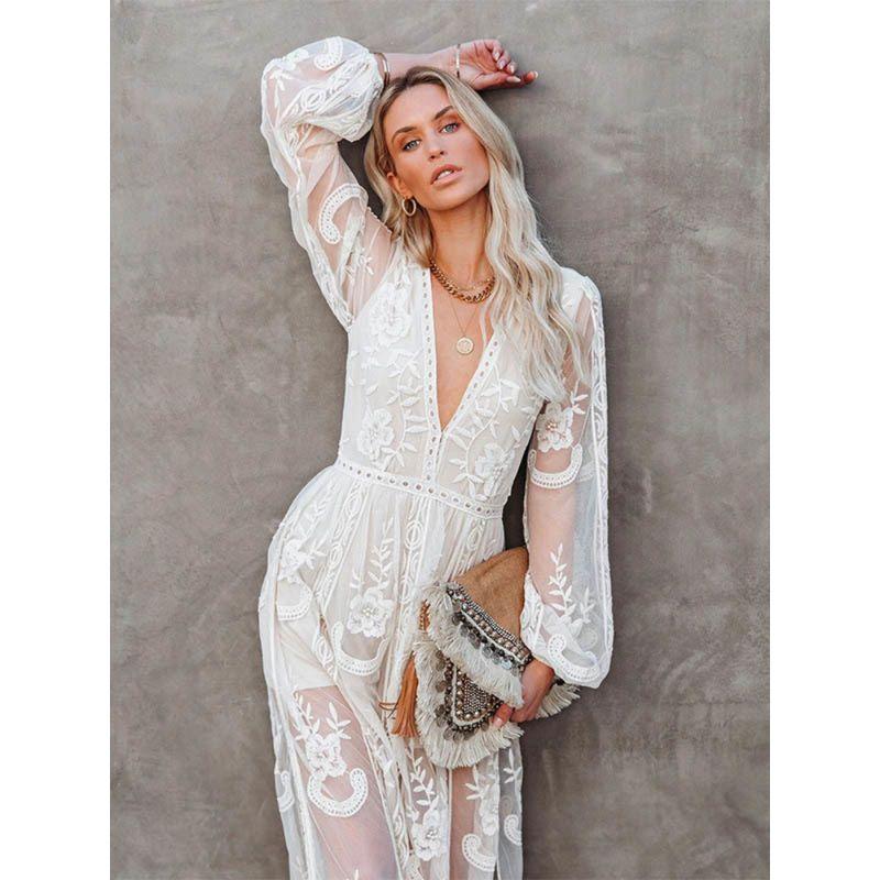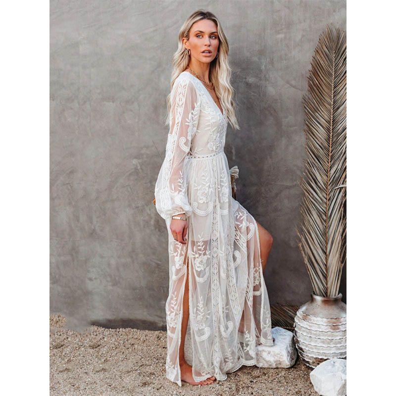 Пляжное платье с вырезами, белое макси-платье с V-образным вырезом и вышивкой