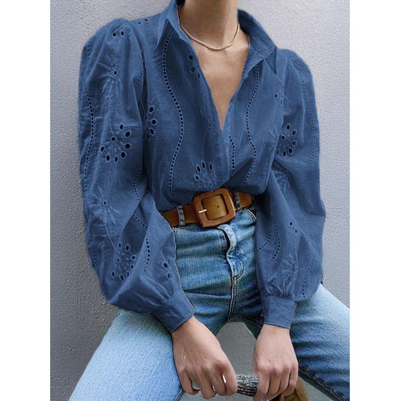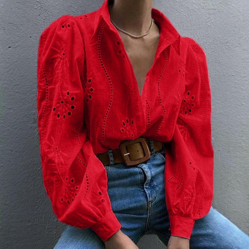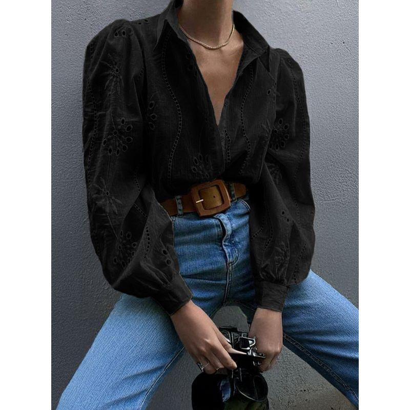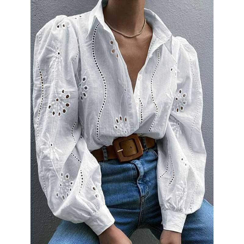 Hollow out Bubble Sleeve Lapel Shirt Pure Color Cut Out Puff Sleeves Lapel Shirt