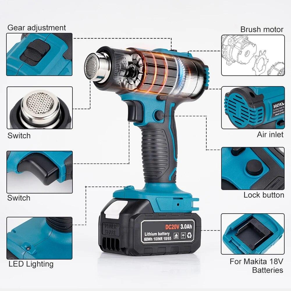 2000 Вт Электрический термофен Горячий Аккумуляторный Ручной Фен Горячего Воздуха с Инструментом для Автомобильной Пленки Промышленный Бытовой Фен для Волос Для Аккумулятора Makita 18 В