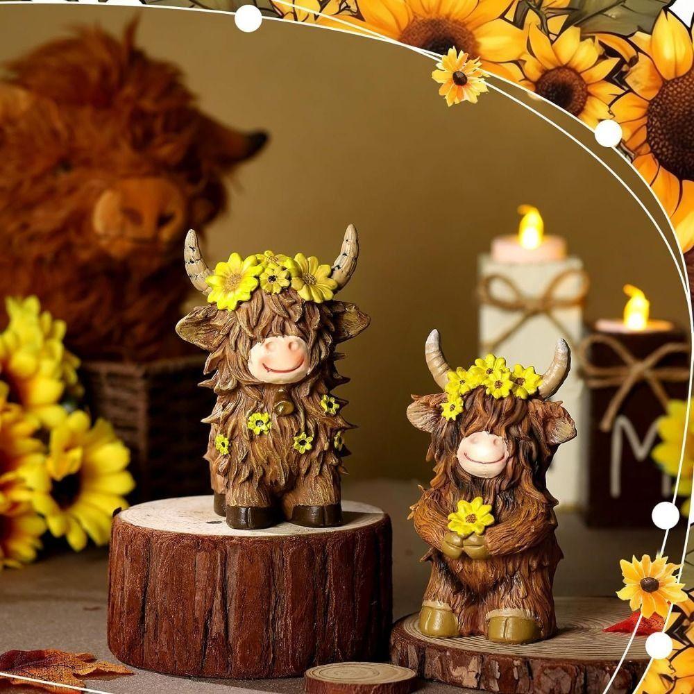 - Очаровательный дизайн: Эти фигурки шотландских коров украшены очаровательными ромашками, передающими причудливую сущность этих любимых сельскохозяйственных животных.. Сложная детализация и реалистичные выражения делают их восхитительным дополнением к любому декору, привносящим в ваше пространство нотку деревенского очарования.