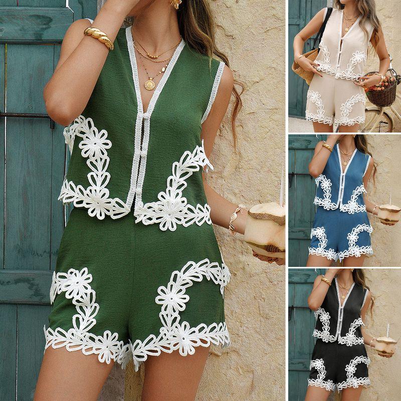 Весна 2025 Лето Трансграничная Европейская и Американская Внешняя Торговля Повседневный Богемный Отпуск Контрастный Цвет Жилет Короткие Штаны Костюм из Двух Предметов