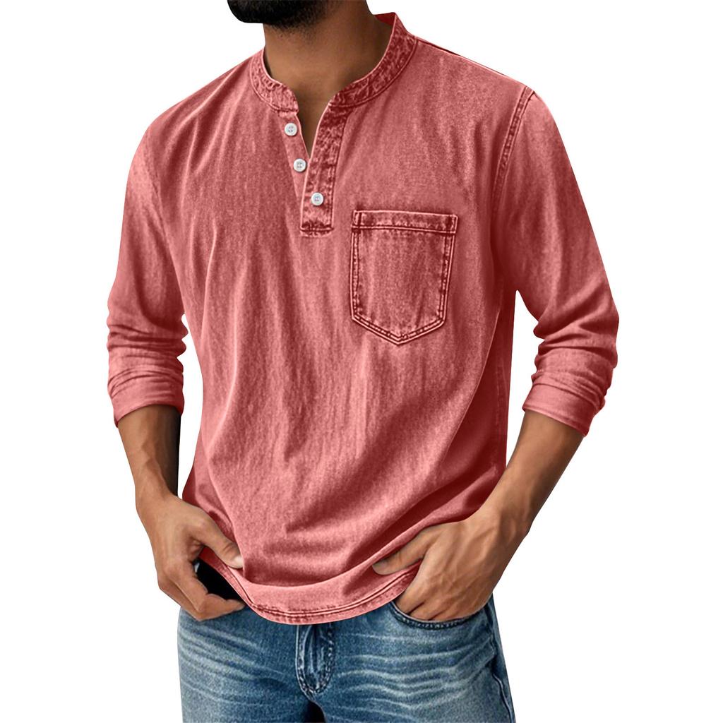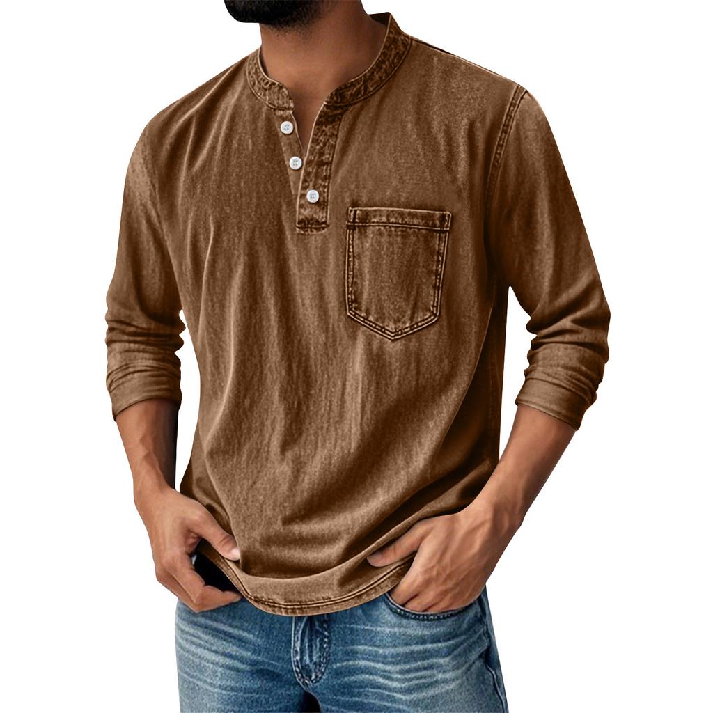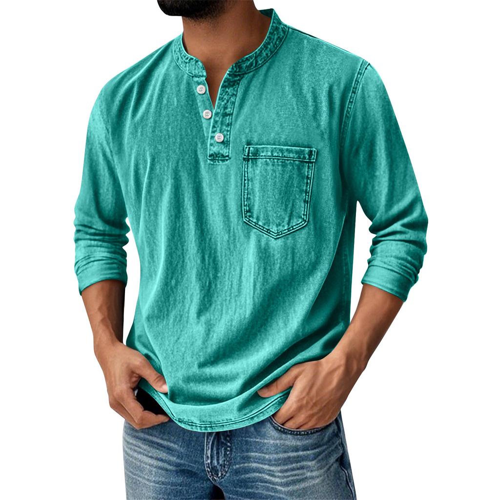 Мужской однотонный выстиранный спортивный топ с карманом на пуговице и воротником-стойкой, с длинным рукавом