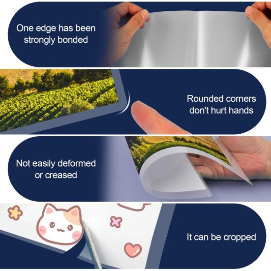 Универсальное использование: Эти прозрачные листы для ламинирования подходят для широкого спектра применений, включая сохранение детских рисунков, офисных документов, визитных карточек, фотографий и рекламных листовок.