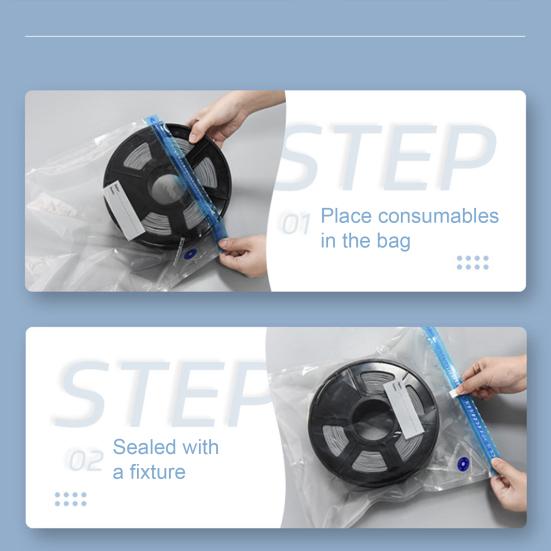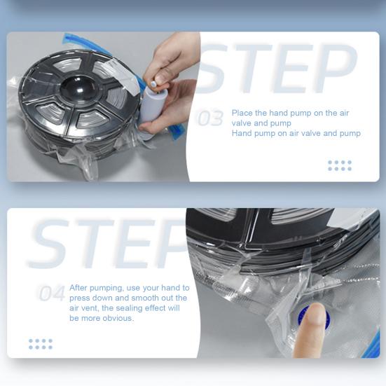 Introducing our filament vacuum storage bags, the perfect solution for keeping your 3D printing filaments dry and your food fresher for longer! Made from high-quality PP material, these bags are tough, durable, and non-deformable, ensuring long-lasting use. Designed specifically for 3D printing supplies, they can also be used for storing food, cameras, lenses, watches, jewelry, and other valuables. Each set includes 5 vacuum compression storage bags and 1 manual air pump, providing you with everything you need to keep your items protected and organized. Simply place the spool in the bag, seal it tightly, and use the hand pump to remove excess air. The flat exhaust port ensures a better sealing effect. Say goodbye to stringing, clogging, poor adhesion, and layer migration caused by wet filaments. Keep your filaments dry and your items safe with our filament vacuum storage bags!
