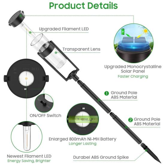 Увеличенная продолжительность освещения: Оцените эффективное и надежное освещение с ярким светом до 12 часов после всего лишь 6 часов зарядки от солнечной энергии.. Эти садовые светильники на солнечных батареях идеально подходят для подъездных путей, садов и патио и обеспечивают длительный срок службы в различных погодных условиях.