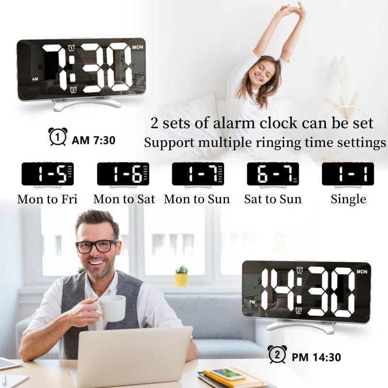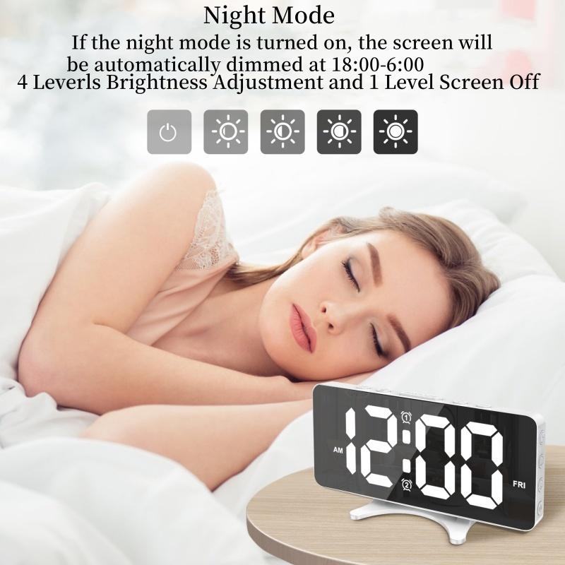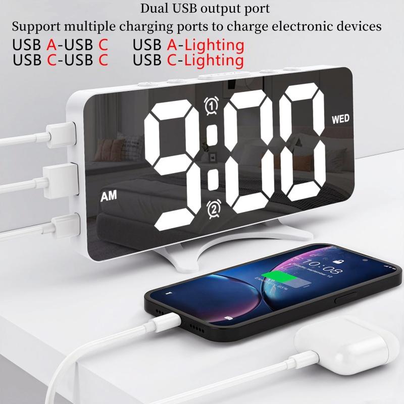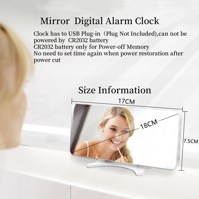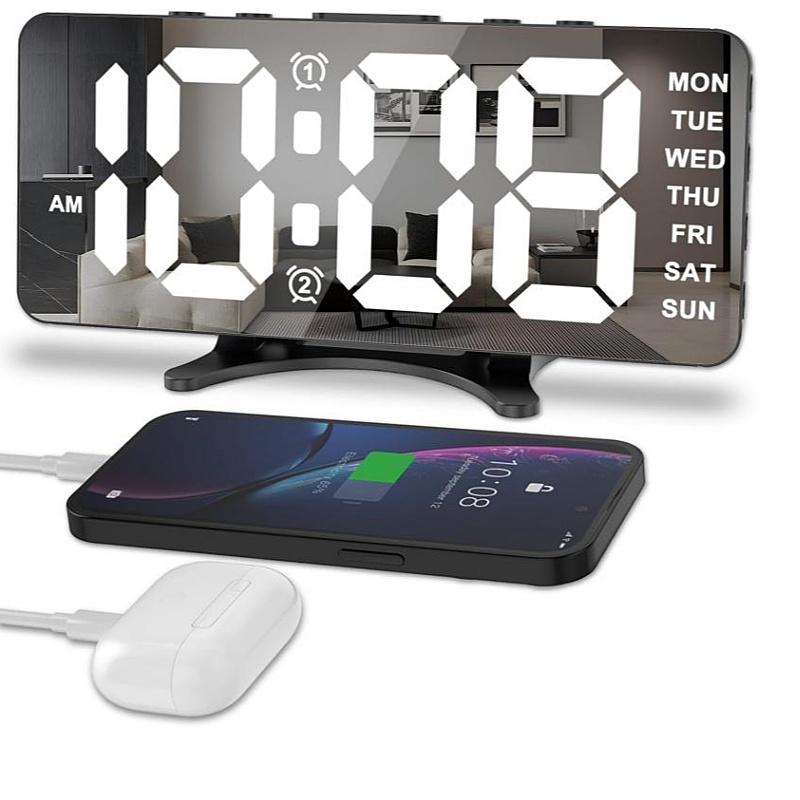 Питание от USB Зеркальный цифровой будильник с 2 неделями Громкие будильники Ночной режим Повтор Настольные часы 12/24-часовой USB-выход Порт светодиодные настенные часы
