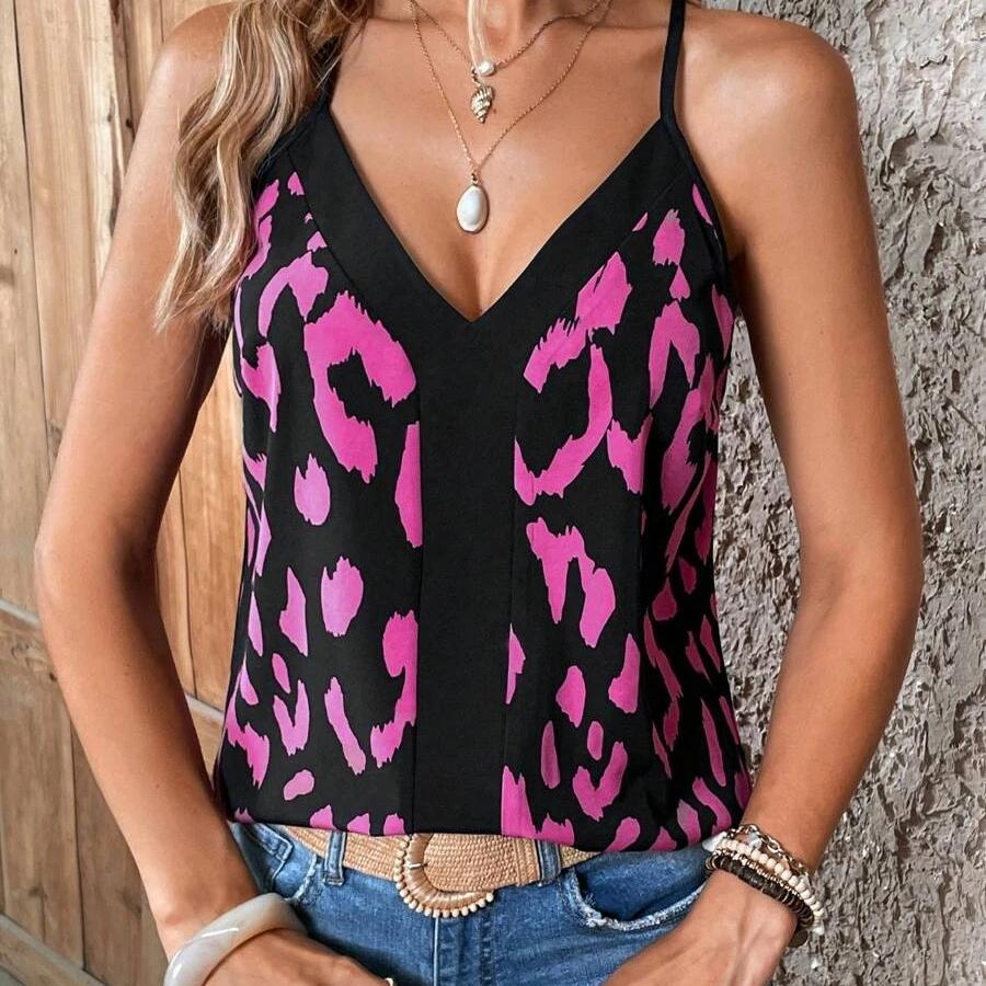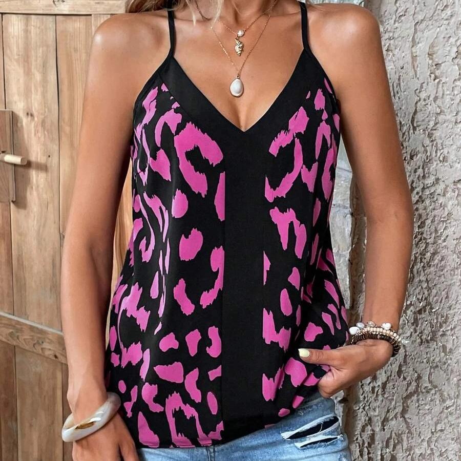 Женская мода на лето и весну, повседневные футболки и топы без рукавов с V-образным вырезом и леопардовым принтом